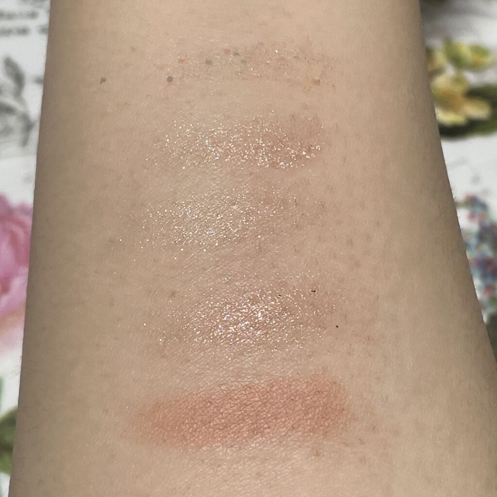 コーラルベース × ゴールドパール × ホワイトパールの3色の組み合わせです!! コーラル系がベースなので日本人の肌に とても馴染むと思います! こちらも薄付きなのでチークは勿論ハイライトとしても使用出来ます! 下瞼から目尻に掛けて塗ればマスク生活でも華やかな目元に仕上がります! コーラル系なので肌を白く見せてくれる色味だと思いました! 使用感も柔かく しっとりしているので保湿効果もあります! デイリーメイクに使いやすい色だと思いました。 目元とリップに重ねると顔全体が統一感が出るので可愛いく仕上げる事が出来ます♡ 写真よりも実際は色味が もっとしっかり出るのでその日の気分によって色の濃さを調整しやすいと思います!