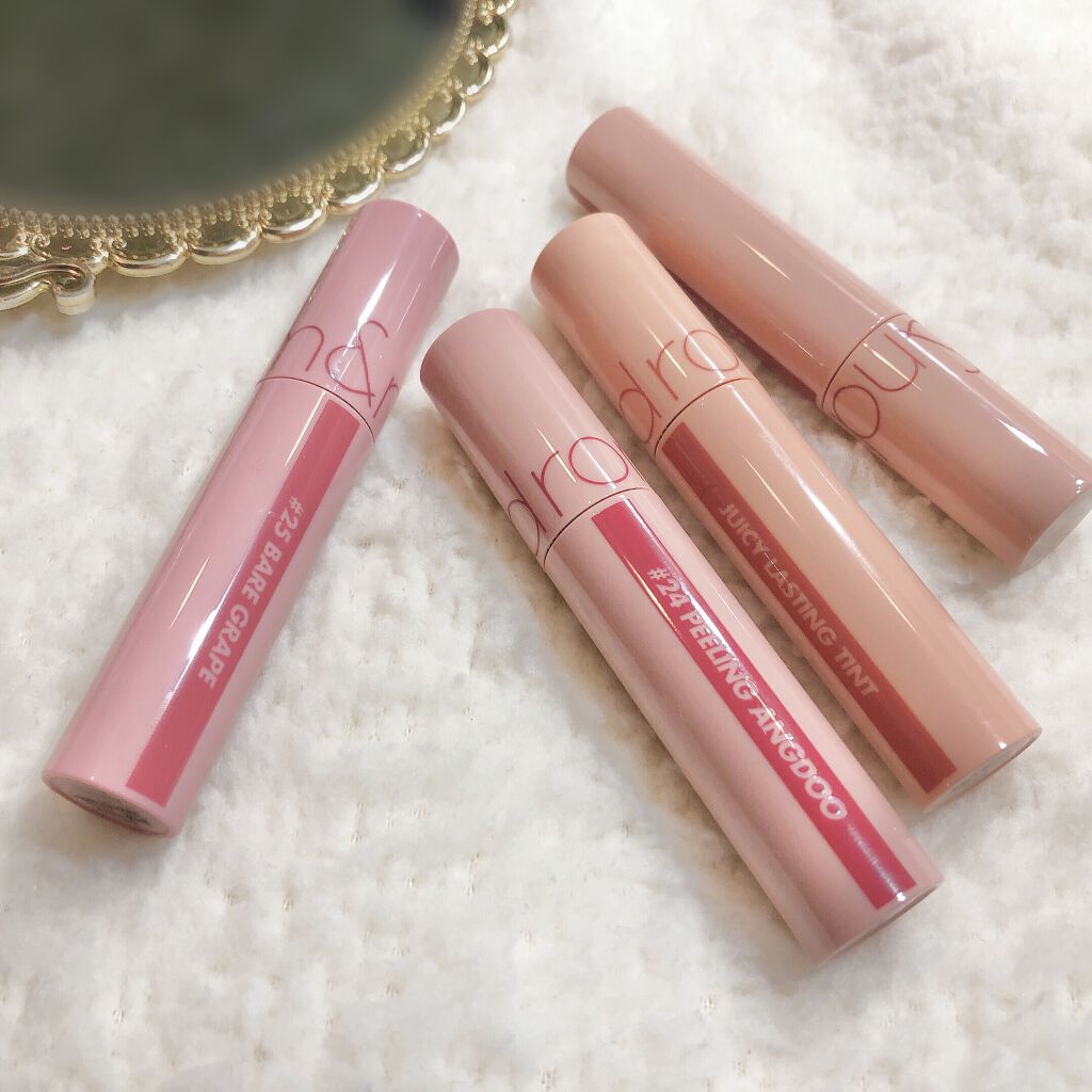 rom&nd ジューシーラスティングティント税込1,320円どれも使いやすいヌーディーカラー🤍⚠️今は商品がリニューアルして、カラー番号が変わってしまっています😓店舗によっては、まだリニューアル前の商品も置いているのですが、色味の参考にでもな...