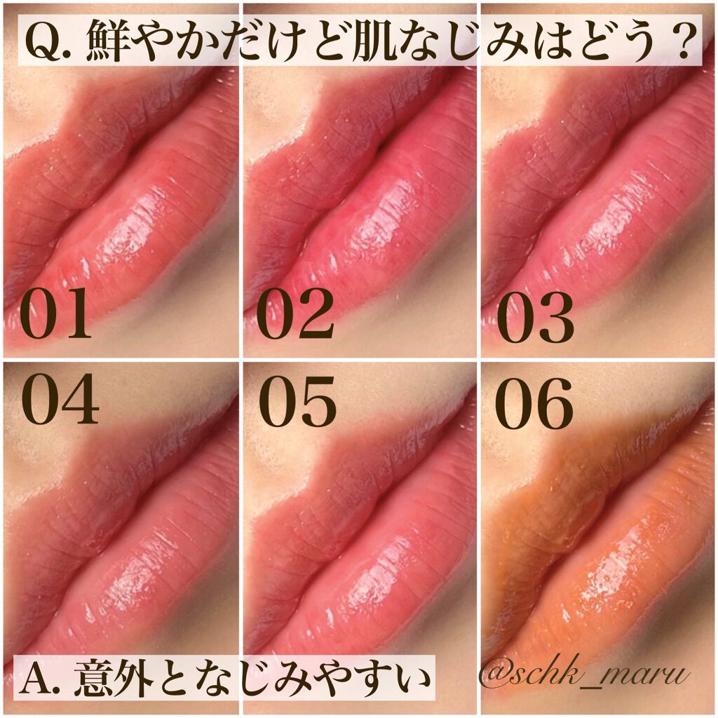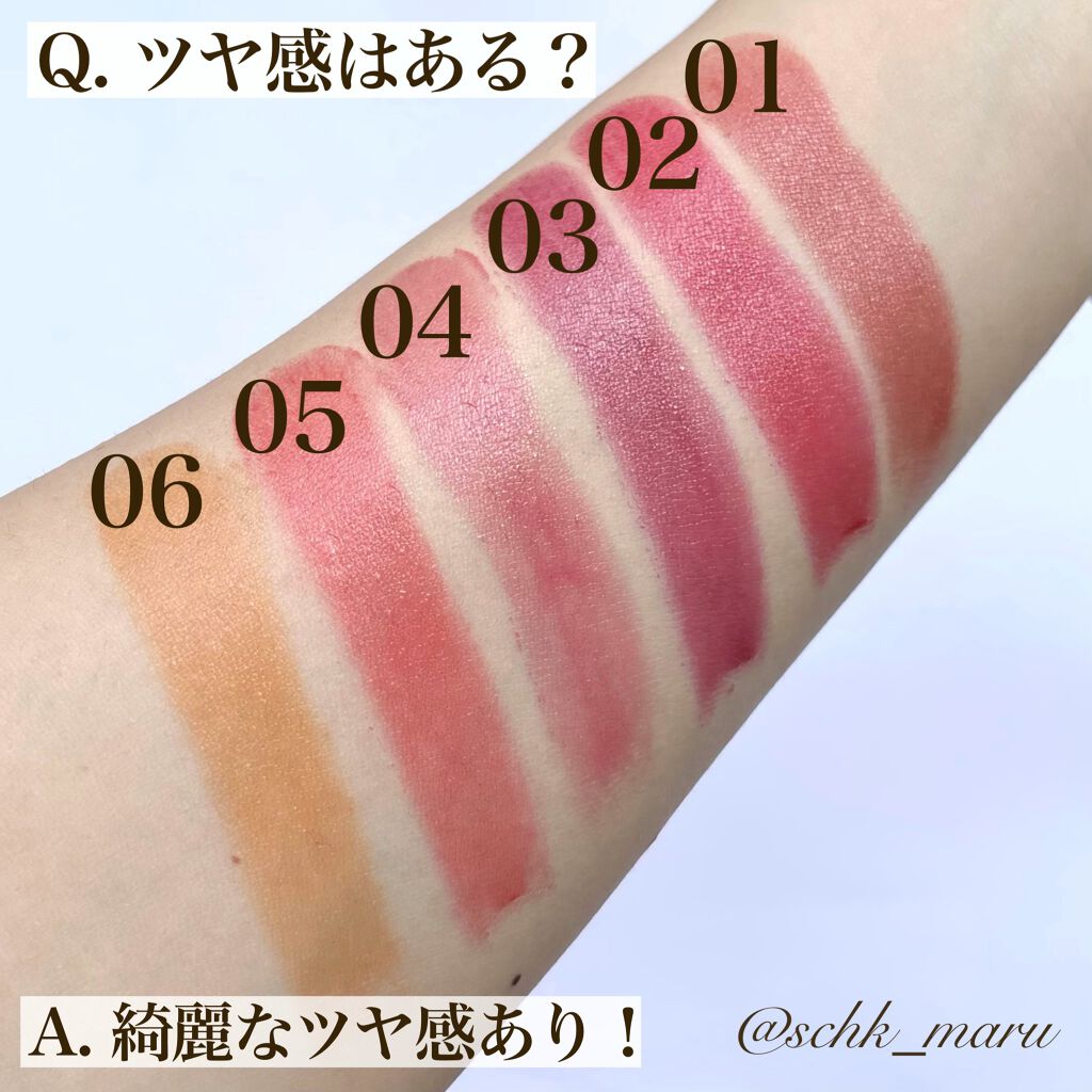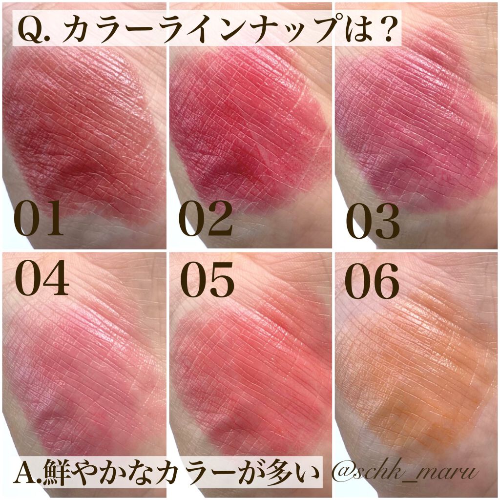 - <01> リンゴ酸ジイソステアリル、テトライソステアリン酸ジペンタエリスリチル、イソノナン酸イソトリ デシル、オクチルドデカノール、水添ポリイソブテン、ジカプリン酸ネオペンチルグリコール、ヘキサヒド ロキシステアリン酸ジペンタエリスリチル、ビスアルキル(C16-18)グリセリルウンデシルジメチコン、パ ラフィン、(ベヘン酸/ポリヒドロキシステアリン酸)ペンタエリスリチル、合成ワックス、マイクロクリスタ リンワックス、セレシン、メトキシケイヒ酸エチルヘキシル、PEG-12ジメチコン、ラウロイルグルタミン酸 ジ(オクチルドデシル/フィトステリル/ベヘニル)、パルミトイルヒドロキシプロピルセルロース、ジステ アルジモニウムヘクトライト、スクワラン、炭酸プロピレン、酢酸トコフェロール、BHT、グリチルレチン酸 ステアリル、シメチコン、カミツレ花エキス、(+/-)セルロース、パルミチン酸、マイカ、ラウロイルアスパ ラギン酸Na、塩化亜鉛、酸化チタン、酸化鉄、水酸化Al、硫酸Ba、トリイソステアリン酸イソプロピル チタン、トリエトキシカプリリルシラン、合成フルオロフロゴパイト、黄4、青1、赤104(1)、赤201、赤202 <02> テトライソステアリン酸ジペンタエリスリチル、イソノナン酸イソトリデシル、オクチルドデカノール、リン ゴ酸ジイソステアリル、水添ポリイソブテン、ジカプリン酸ネオペンチルグリコール、ヘキサヒドロキシステア リン酸ジペンタエリスリチル、ビスアルキル(C16-18)グリセリルウンデシルジメチコン、パラフィン、(ベヘ ン酸/ポリヒドロキシステアリン酸)ペンタエリスリチル、合成ワックス、ラウロイルグルタミン酸ジ(オクチ ルドデシル/フィトステリル/ベヘニル)、マイクロクリスタリンワックス、セレシン、メトキシケイヒ酸エチル ヘキシル、PEG-12ジメチコン、パルミトイルヒドロキシプロピルセルロース、ジステアルジモニウムヘクトラ イト、ヒドロキシステアリン酸エチルヘキシル、スクワラン、炭酸プロピレン、酢酸トコフェロール、BHT、グリチ ルレチン酸ステアリル、シメチコン、カミツレ花エキス、(+/-)セルロース、パルミチン酸、マイカ、ラウロ イルアスパラギン酸Na、塩化亜鉛、酸化チタン、酸化鉄、水酸化Al、硫酸Ba、トリイソステアリン酸イソプ ロピルチタン、トリエトキシカプリリルシラン、合成フルオロフロゴパイト、黄4、黄5、赤104(1)、赤201、赤202 <03> リンゴ酸ジイソステアリル、テトライソステアリン酸ジペンタエリスリチル、イソノナン酸イソトリ デシル、オクチルドデカノール、水添ポリイソブテン、ジカプリン酸ネオペンチルグリコール、ヘキサヒド ロキシステアリン酸ジペンタエリスリチル、ビスアルキル(C16-18)グリセリルウンデシルジメチコン、パ ラフィン、(ベヘン酸/ポリヒドロキシステアリン酸)ペンタエリスリチル、合成ワックス、マイクロクリスタ リンワックス、セレシン、メトキシケイヒ酸エチルヘキシル、PEG-12ジメチコン、ラウロイルグルタミン酸 ジ(オクチルドデシル/フィトステリル/ベヘニル)、パルミトイルヒドロキシプロピルセルロース、ジステ アルジモニウムヘクトライト、スクワラン、炭酸プロピレン、酢酸トコフェロール、BHT、グリチルレチン酸 ステアリル、シメチコン、カミツレ花エキス、(+/-)セルロース、パルミチン酸、マイカ、ラウロイルアスパ ラギン酸Na、塩化亜鉛、酸化チタン、酸化鉄、水酸化Al、硫酸Ba、トリイソステアリン酸イソプロピル チタン、トリエトキシカプリリルシラン、合成フルオロフロゴパイト、黄4、青1、赤104(1)、赤201、赤202 <05> リンゴ酸ジイソステアリル、テトライソステアリン酸ジペンタエリスリチル、イソノナン酸イソトリ デシル、オクチルドデカノール、水添ポリイソブテン、ジカプリン酸ネオペンチルグリコール、ヘキサヒド ロキシステアリン酸ジペンタエリスリチル、ビスアルキル(C16-18)グリセリルウンデシルジメチコン、パ ラフィン、(ベヘン酸/ポリヒドロキシステアリン酸)ペンタエリスリチル、合成ワックス、マイクロクリスタ リンワックス、セレシン、メトキシケイヒ酸エチルヘキシル、PEG-12ジメチコン、ラウロイルグルタミン酸 ジ(オクチルドデシル/フィトステリル/ベヘニル)、パルミトイルヒドロキシプロピルセルロース、ジステ アルジモニウムヘクトライト、スクワラン、炭酸プロピレン、酢酸トコフェロール、BHT、グリチルレチン酸 ステアリル、シメチコン、カミツレ花エキス、(+/-)セルロース、パルミチン酸、マイカ、ラウロイルアスパ ラギン酸Na、塩化亜鉛、酸化チタン、酸化鉄、水酸化Al、硫酸Ba、トリイソステアリン酸イソプロピル チタン、トリエトキシカプリリルシラン、合成フルオロフロゴパイト、黄4、青1、赤104(1)、赤201、赤202 <07 ラズベリーチョコレート> テトライソステアリン酸ジペンタエリスリチル、イソノナン酸イソトリデシル、オクチルドデカノール、水添ポリイソブテン、ジカプリン酸ネオペンチルグリコール、リンゴ酸ジイソ