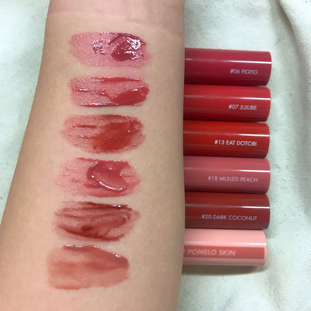 - <06 フィグフィグ(FIGFIG)> 水、オクチルドデカノール、ジメチコン、変性アルコール、アクリレーツコポリマー、ステアリン酸ソルビタン、エチルセルロース、ベヘニルアルコール、ペンチレングリコール、キウイエキス、パパイア果実エキス、グレープフルーツ果実エキス、ココヤシ果実エキス、マンゴー果実エキス、グアバ果実エキス、ポリソルベート60、シリカ、(アクリル酸Na/アクリロイルジメチルタウリンNa)コポリマー、リンゴ酸ジイソステアリル、トリイソステアリン酸ポリグリセリル-2、イソヘキサデカン、ポリソルベート80、ジイソステアリン酸ポリグリセリル-2、オレイン酸ソルビタン、エチルヘキシルグリセリン、BG、EDTA-2Na、フェノキシエタノール、香料、酸化チタン、酸化鉄、赤202、赤227、黄5、赤102、青1 <07 ジュジュブ(JUJUBE)> 水、オクチルドデカノール、ジメチコン、変性アルコール、アクリレーツコポリマー、ステアリン酸ソルビタン、エチルセルロース、ベヘニルアルコール、ペンチレングリコール、キウイエキス、パパイア果実エキス、グレープフルーツ果実エキス、ココヤシ果実エキス、マンゴー果実エキス、グアバ果実エキス、ポリソルベート60、シリカ、(アクリル酸Na/アクリロイルジメチルタウリンNa)コポリマー、トリイソステアリン酸ポリグリセリル-2、リンゴ酸ジイソステアリル、イソヘキサデカン、ポリソルベート80、ジイソステアリン酸ポリグリセリル-2、オレイン酸ソルビタン、エチルヘキシルグリセリン、BG、EDTA-2Na、フェノキシエタノール、香料、酸化チタン、酸化鉄、赤202、赤227、黄5、黄4、青1 <08 アップルブラウン(APPLE BROWN)> 水、オクチルドデカノール、ジメチコン、変性アルコール、アクリレーツコポリマー、ステアリン酸ソルビタン、エチルセルロース、ベヘニルアルコール、ペンチレングリコール、キウイエキス、パパイア果実エキス、グレープフルーツ果実エキス、ココヤシ果実エキス、マンゴー果実エキス、グアバ果実エキス、ポリソルベート60、シリカ、(アクリル酸Na/アクリロイルジメチルタウリンNa)コポリマー、トリイソステアリン酸ポリグリセリル-2、イソヘキサデカン、リンゴ酸ジイソステアリル、ポリソルベート80、ジイソステアリン酸ポリグリセリル-2、オレイン酸ソルビタン、エチルヘキシルグリセリン、BG、EDTA-2Na、フェノキシエタノール、香料、酸化鉄、黄5、赤202、酸化チタン、赤227、青1 <11 ピンクパンプキン(PINK PUMPKIN)> 水、オクチルドデカノール、ジメチコン、変性アルコール、アクリレーツコポリマー、ステアリン酸ソルビタン、エチルセルロース、ベヘニルアルコール、ペンチレングリコール、キウイエキス、パパイア果実エキス、グレープフルーツ果実エキス、ココヤシ果実エキス、マンゴー果実エキス、グアバ果実エキス、ポリソルベート60、シリカ、(アクリル酸Na/アクリロイルジメチルタウリンNa)コポリマー、リンゴ酸ジイソステアリル、イソヘキサデカン、トリイソステアリン酸ポリグリセリル-2、ポリソルベート80、ジイソステアリン酸ポリグリセリル-2、オレイン酸ソルビタン、エチルヘキシルグリセリン、BG、EDTA-2Na、フェノキシエタノール、香料、酸化チタン、酸化鉄、赤202、黄4、赤227、黄5、赤104(1) <22 ポメロスキン(POMELO SKIN)> 水、オクチルドデカノール、ジメチコン、変性アルコール、アクリレーツコポリマー、ポリソルベート60、エチルセルロース、ベヘニルアルコール、ペンチレングリコール、(アクリル酸Na/アクリロイルジメチルタウリンNa)コポリマー、シリカ、ステアリン酸ソルビタン、イソヘキサデカン、リンゴ酸ジイソステアリル、フェノキシエタノール、酸化チタン、トリイソステアリン酸ポリグリセリル-2、ポリソルベート80、酸化鉄、香料、オレイン酸ソルビタン、エチレンジアミンジコハク酸3Na、エチルヘキシルグリセリン、赤202、ジイソステアリン酸ポリグリセリル-2、赤227、黄5、青1、BG、キウイエキス、パパイア果実エキス、グレープフルーツ果実エキス、ココヤシ果実、マンゴー果実エキス、グアバ果実エキス <23 ヌカダミア(NUCADAMIA)> 水、オクチルドデカノール、ジメチコン、変性アルコール、アクリレーツコポリマー、ポリソルベート60、エチルセルロース、ベヘニルアルコール、ペンチレングリコール、(アクリル酸Na/アクリロイルジメチルタウリンNa)コポリマー、シリカ、ステアリン酸ソルビタン、イソヘキサデカン、フェノキシエタノール、リンゴ酸ジイソステアリル、酸化チタン、ポリソルベート80、トリイソステアリン酸ポリグリセリル-2、酸化鉄、香料、オレイン酸ソルビタン、エチレンジアミンジコハク酸3Na、赤202、赤227、黄5、ジイソステアリン酸ポリグリセリル-2、エチルヘキシルグリセリン、黄4、青1、BG、キウイエキス、パパイア果実エキス、グレープフルーツ果実エキス、ココヤシ果実、マンゴー果実エキス <24 ピーリングエンドゥ(PEELING ANGDOO)> 水、オクチルドデカノール、ジメチコン、変性アル