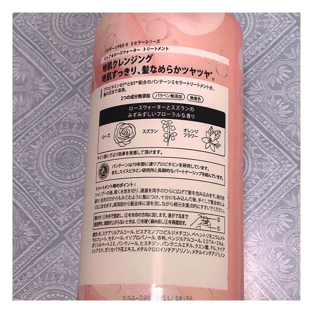 - 感動の地肌クレンジングで、サラサラ髪へ。 地肌すっきり、髪なめらかツヤツヤ。 ☆地肌クレンジング成分「ミセラー粒子」配合*で、髪と地肌の毛穴の目に見えないミクロな汚れまでマグネット吸着。しっかり洗い流します。 ☆クレンジングした後は、パンテーンミセラートリートメントでしっかりうるおいを与えます。プロビタミンB5*2とB3*3配合のパンテーンミセラーシリーズで、地肌すっきり、髪なめらかツヤツヤ。 ☆ローズウォーターとスズランのみずみずしいフローラルな香り *ライン使い *2パンテノール、パンテニルエチル(浸透性保湿成分)*3ナイアシンアミド(コンディショニング成分)