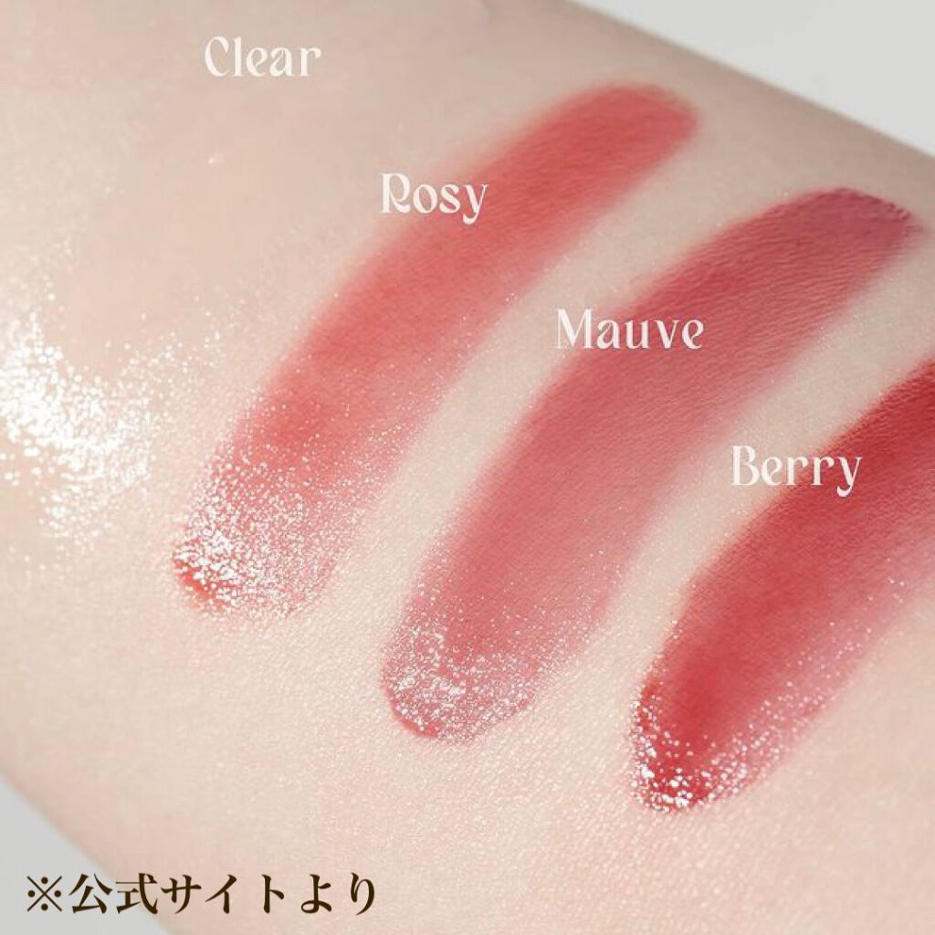 - <クリア> ヒマワリ種子油、オクチルドデカノール、トリイソステアリン酸ポリグリセリル-2、エチルヘキサン酸セチル、シア脂、ダイマージリノール酸(フィトステリル/イソステアリル/セチル/ステアリル/ ベヘニル)、合成 ワックス、(イソステアリン酸ポリグリセリル-2/ダイマージリノール酸)コポリマー、マイクロクリスタリンワックス、リンゴ酸ジイソステアリル、ヒマシ油、セレシン、キャンデリラロウ、マカデミアナッツ油ポリグリセリル-6エステルズベヘネート、オリーブ油脂肪酸ソルビタン、アーモンド油、セスキオレイン酸ソルビタン(小麦由来)、酢酸トコフェロール、ポ リリシノレイン酸ポリグリセリル-6、オレンジ油、デヒドロ酢酸、マンダリンオレンジ果皮油、アオモジ果実油、水、メドウフォーム油、トコフェロール、加水分解ヒアルロン酸、BG、1,2-ヘキ サンジオール、グリセリン、アボカ ドエキス、ケール葉エキス <モーヴ> ヒマワリ種子油、オクチルドデカノール、エチルヘキサン酸セチル、リンゴ酸ジイソステアリル、シア脂、トリイソステアリン酸ポリグリセリル-2、ダイマージリノール酸(フィトステリル/イソステアリル/セチル/ステアリル/ベヘニル)、合成ワックス、(イソステアリン酸ポリグリセリル-2/ダイマージリノール酸)コポリマー、マイクロクリスタリンワックス、ヒマシ油、セレシン、キャンデリラロウ、マカデミアナッツ油ポリグリセリル- 6エステルズベヘネート、オリーブ油脂肪酸ソルビタン、アーモンド油、酸化チタン、セスキオレイン酸ソルビタン(小麦由来)、酢酸トコフェロール、ポリ リシノレイン酸ポリグリセリル-6、オ レンジ油、硫酸Ba、デヒドロ酢酸、マ ンダリンオレンジ果皮油、ロジン、アオ モジ果実油、メドウフォーム油、トコ フェロール、加水分解ヒアルロン酸、ニンファエアコエルレア花水、水、B G、1,2-ヘキサンジオール、ヨー ロッパキイチゴ果実エキス、ローブッ シュブルーベリー果実エキス、マグワ 根皮エキス、エゾヘビイチゴ果実エキ ス、酸化鉄、赤202、青1、赤201 <ロージー> ヒマワリ種子油、オクチルドデカノール、エチルヘキサン酸セチル、トリイソステアリン酸ポリグリセリル-2、シア脂、ダイマージリノール酸(フィトステリル/イソステアリル/セチル/ステアリル/ベヘニル)、リンゴ酸ジイソステアリル、合成ワックス、(イソステアリン酸ポリグリセリル-2/ダイマージリノール酸)コポリマー、マ イクロクリスタリンワックス、ヒマシ油、セレシン、キャンデリラロウ、マカデミアナッツ油ポリグリセリル- 6エステルズベヘネート、オリーブ油脂肪酸ソルビタン、アーモンド油、酸化チタン、セスキオレイン酸ソルビタン(小麦由来)、酢酸トコフェロール、ポリリシノレイン酸ポリグリセリル-6、オレンジ油、硫酸Ba、デヒドロ酢酸、マンダリン オレンジ果皮油、アオモジ果実油、ロジン、水、メドウフォーム油、トコフェロール、加水分解ヒアルロン酸、BG、アンズ果実エキス、1,2-ヘキサンジオール、カニナバラ果実エキス、カプリリルグリコール、酸化鉄、赤201、赤202 <ベリー> ヒマワリ種子油、オクチルドデカノール、エチルヘキサン酸セチル、トリイソステアリン酸ポリグリセリル-2、シア脂、リンゴ酸ジイソステアリル、ダイマージリノール酸(フィトステリル/イソステアリル/セチル/ステアリル/ベヘニル)、合成ワックス、(イソステアリン酸ポリグリセリル-2/ダイマージリノール酸)コポリマー、マイクロクリスタリンワックス、ヒマシ油、セレシン、キャンデリラロウ、マカデミアナッツ油ポリグリセリル-6エステルズベヘネート、オリーブ油脂肪酸ソルビタン、アーモンド油、セスキオレイン酸ソルビタン(小麦由来)、酢酸トコフェロール、ポ リリシノレイン酸ポリグリセリル-6、硫酸Ba、オレンジ油、デヒドロ酢酸、マンダリンオレンジ果皮油、ロジン、アオモジ果実油、水、メドウフォーム油、トコフェロール、加水分解ヒアル ロン酸、BG、クランベリー果実エキス、1,2-ヘキサンジオール、ヨー ロッパキイチゴ果実エキス、ローブッシュブルーベリー果実エキス、マグワ根皮エキス、エゾヘビイチゴ果実エキス、酸化鉄、赤202、赤201