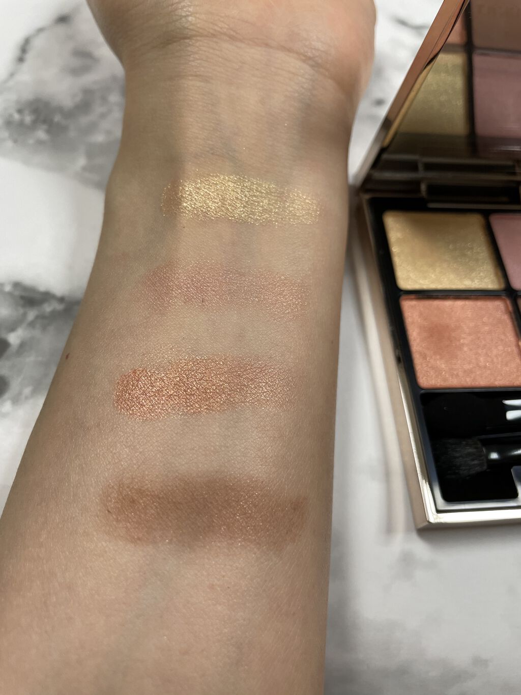 手持ちの429と、色味が似ていると思い比較してみました。 773の下段が白に偏光パールなことを除けば、かなり近い色味かな、と思いました。 429は偏光ピンクパール。 ・粉質が悪い、チップで一度塗っただけでポロポロ崩れてきた 去年ディオールの化粧品三つ破損しているので、品質に対する信用は低めかも😞 ・思ったよりは発色しない。薄めの発色です。
