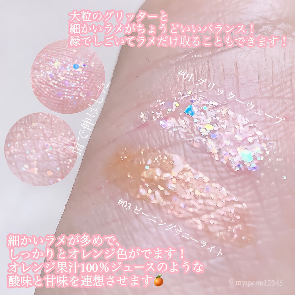 - <01 GLITTER WAVE> 水、BG、PET、ホウケイ酸(Ca/Al)、アクリレーツコポリマー、(エチレン/VA)コポリマー、ペンチレングリコール、1,2-ヘキサンジオール、シリカ、トロメタミン、カルボマー、カプリリルグリコール、ポリウレタン-11、ポリメタクリル酸メチル、プロパンジオール、エチルヘキシルグリセリン、マイカ、酸化スズ、酢酸ビニル、ダイウイキョウ果実エキス、ポリ酢酸ビニル、酸化チタン、Al、カルミン <02 SODAPOP FLAKES> 水、PET、BG、ホウケイ酸(Ca/Al)、アクリレーツコポリマー、ペンチレングリコール、1,2-ヘキサンジオール、マイカ、シリカ、(エチレン/VA)コポリマー、トロメタミン、カルボマー、ポリウレタン-11、カプリリルグリコール、ポリメタクリル酸メチル、プロパンジオール、エチルヘキシルグリセリン、酸化スズ、ダイウイキョウ果実エキス、ポリ酢酸ビニル、酸化チタン、酸化鉄、カルミン、Al <03 BEAMING SUNNY-LIGHT> 水、PET、BG、ホウケイ酸(Ca/Al)、アクリレーツコポリマー、合成フルオロフロゴパイト、ペンチレングリコール、1,2-ヘキサンジオール、シリカ、カルボマー、トロメタミン、ポリウレタン-11、カプリリルグリコール、プロパンジオール、ポリメタクリル酸メチル、エチルヘキシルグリセリン、酸化スズ、ダイウイキョウ果実エキス、酸化チタン、黄4、酸化鉄、カルミン、Al