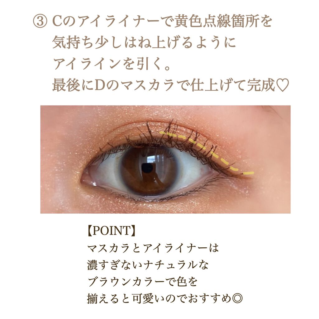 馴染みやすい色のため、ピンクが苦手な方でも挑戦しやすいメイクです。 アイライナーやマスカラは淡い色のものを使用し、印象が強くなりすぎないようにしています。 アイシャドウの塗り方は目の形に合わせて工夫してみてください👀