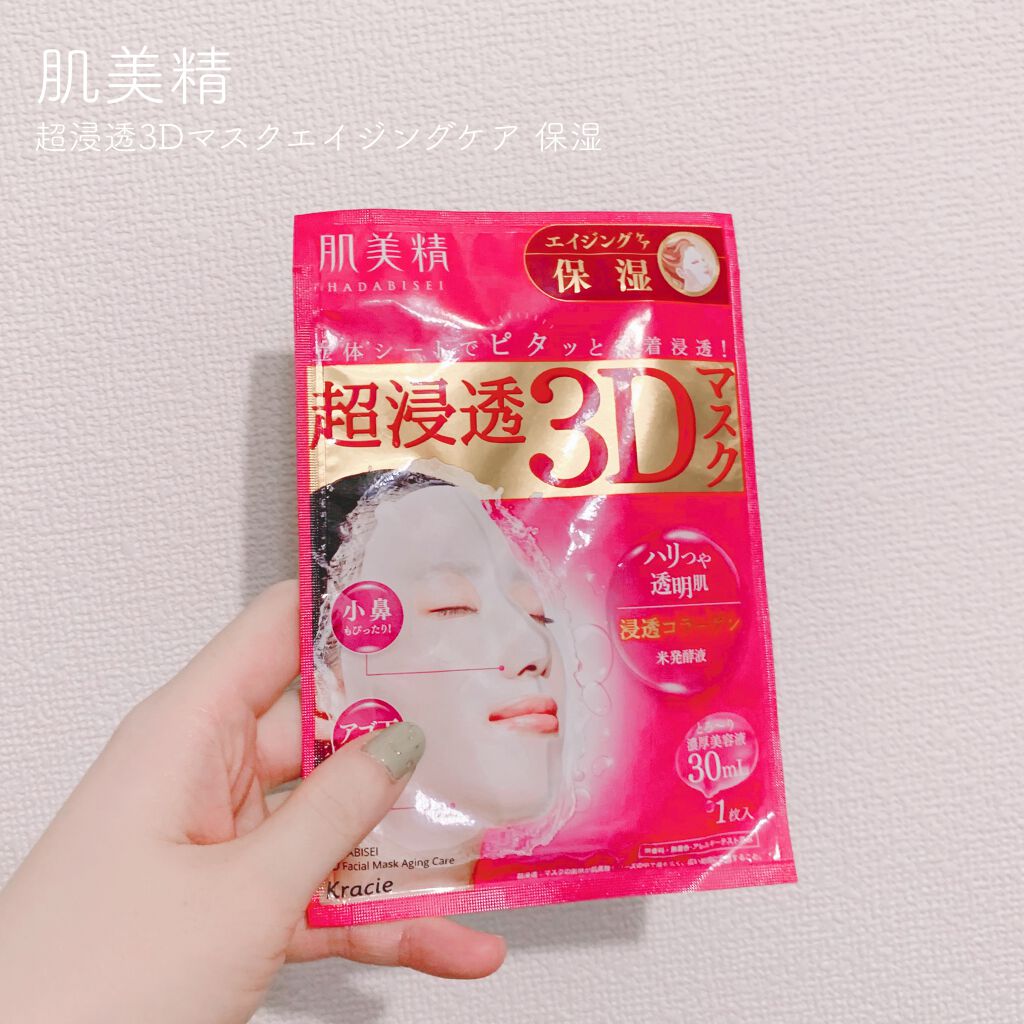 顔の凹凸にピッタリフィット!!立体形状マスク✨✨肌美精 超浸透3Dマスクエイジングケアとろみのある濃厚美容液がたっぷり30ml浸透した保湿効果の高いシートマスクです!かなりしっとりもちもちのお肌になれました♪翌朝まで潤いが続くのを実感🥹🥹あご...