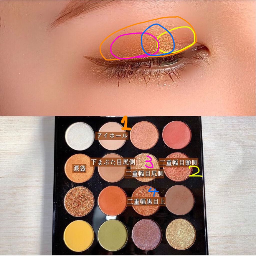 メイクが好みすぎて真似をしてみたのですが上手くできず…上まぶたのベースのオレンジは上記のラメだけで作ってるのでしょうか?