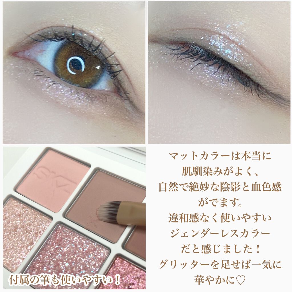 - ひとつのパレットにマット、シマー、グリッターなど多様な質感を贅沢に使用。塗る順序やカラーの組み合わせを変えるだけでデイリーメイクにも、特別な日のお出かけメイクにもできる優れもの。また粉飛びせず、まぶたにしっかり密着します。