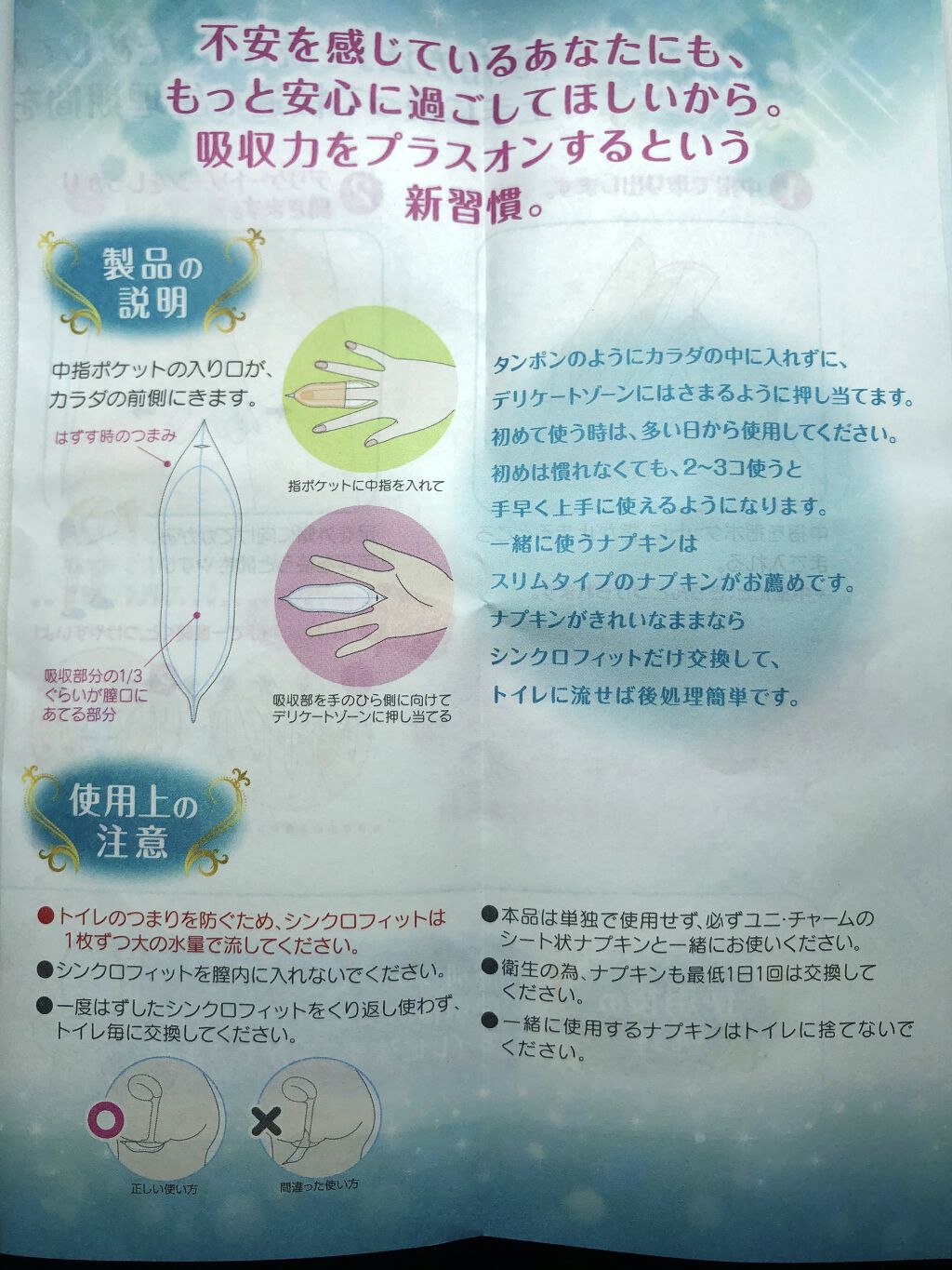 - 生理期間の経血のモレ不安を軽減するほか、使用後はトイレに流せるという利便性も兼ね備えた新感覚の生理用品です。 カラダにさっとはさんで、ナプキンと一緒に使用することで約2時間分の吸収力をプラスオンすることができます。 また使用後の製品も個別ラップもトイレに流すことができるため、後処理が簡単です。