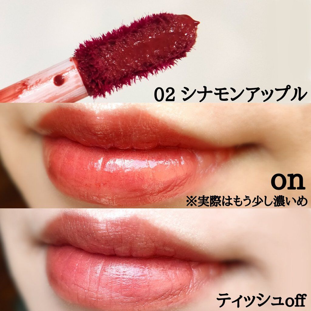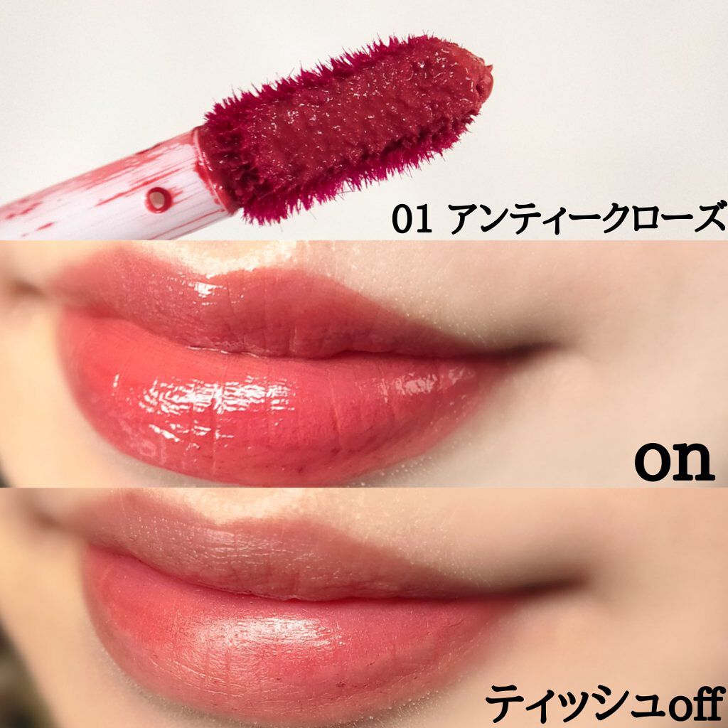 - ツヤ膜でLIPカラーを閉じ込める 塗ってから「5分」でかわいい唇完成♥ツヤがあふれ出るオイルinウォーターティント 水に対して約2倍のオイル成分を配合した「オイルinウォーター処方」 時間経過でツヤ膜がじゅわ~っとあふれ出し、 まるでグロスを重ねたような仕上がりに。みずみずしいツヤ感が持続します。 塗布後、時間経過(※)で色が定着して食べても飲んでも血色長持ち。 (※定着には個人差があります。弊社5分推奨) 高密着で唇に溶け込むように色づきます。 コップやペットボトルへの色移りがしにくくなります。