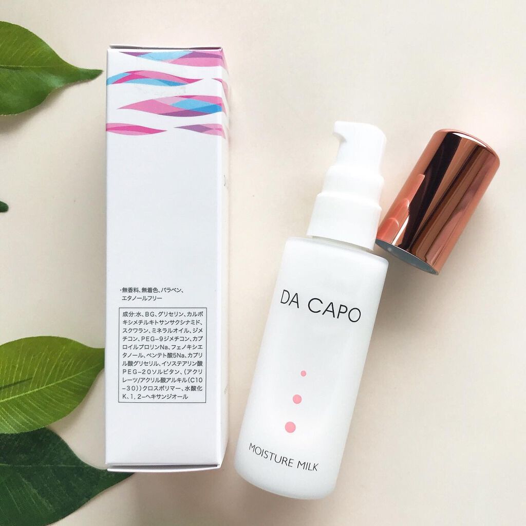 - みずみずしいテクスチャーでしっかりうるおいを肌に閉じ込め、艶やかな素肌に導く乳液です。使用後はべた付かず、ついさわりたくなる肌に。DA CAPOは、北海道の自然の恵みを活かした肌にやさしい(※1)敏感肌向けスキンケアブランドです。天然系保湿成分「キトサンエキス(※2)」を全ての商品に配合しており、肌の表面にうるおい膜を形成し、外界の刺激から肌を守りながら、肌内部の水分が蒸発するのを防いで保湿性を発揮します。※1すべての方に肌トラブルが起こらないわけではありません。※2カルボキシメチルキトサンサクシナミド