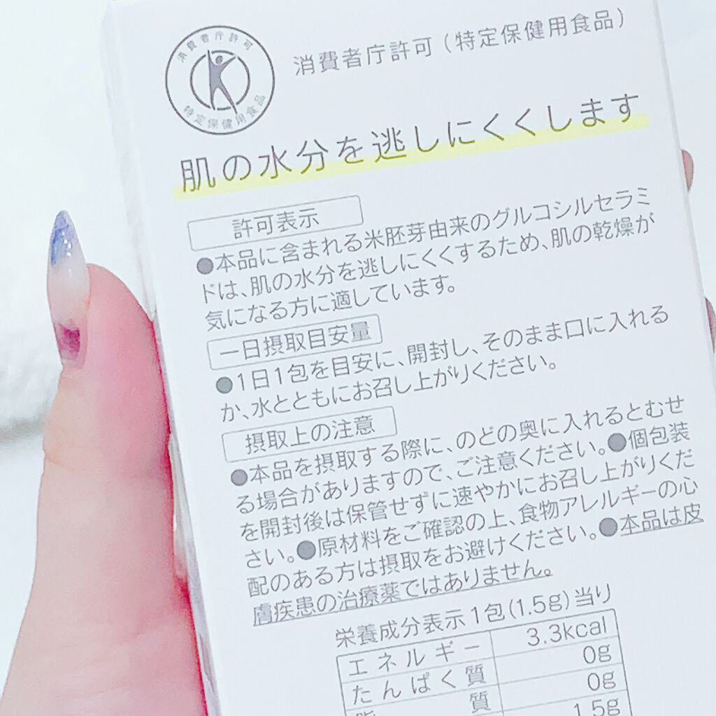 - 日本初(*1)“肌にもトクホ(*2)”! 肌の乾燥が気になる方に。高純度に精製した米胚芽由来のグルコシルセラミドを配合。「肌の水分を逃しにくくするため、肌の乾燥が気になる方に適している」と許可された、特定保健用食品(トクホ)のインナースキンケアです。 “飲むスキンケア”だから、顔だけでなく、背中や足など、スキンケア機能は全身にも。なかなか手が回らない、ボディの乾燥対策にもおすすめです。 水なしで飲めるゆず風味のさわやかなパウダーだから、いつでもどこでもおいしくスキンケアできます。 *1 販売商品として。 *2 許可表示:本品に含まれる米胚芽由来のグルコシルセラミドは、肌の水分を逃しにくくするため、肌の乾燥が気になる方に適しています。 ※本品に含まれる米胚芽由来のグルコシルセラミドは、肌の水分を逃がしにくくするため、肌の乾燥が気になる方に適しています。 ※関与成分:米胚芽由来グルコシルセラミド1.8mg(1包当り) ※本品は皮膚疾患の治療薬ではありません。 ※多量摂取により疾病が治癒したり、より健康が増進するものではありません。他の食品からの摂取量を考えて適量を摂取してください。 ※食生活は、主食、主菜、副菜を基本に、食事のバランスを。 ※「みんなのクチコミ」はあくまで個人の感想であり、効果効能を保証するものではございません。 ●1日1包を目安に、開封し、そのまま口に入れるか、水とともにお召し上がりください。 ※妊娠・授乳中の方は、お医者様とご相談のうえお召し上がりください。 <ピーチ風味> 甘い香りと爽やかな甘味が楽しめるピーチ風味 <マスカット風味> 芳醇な香りとすっきりした酸味が楽しめるマスカット風味 <ゆず風味> さわやかなゆず風味
