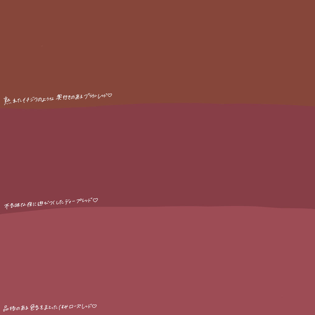 - <01 欲望の塊> テトライソステアリン酸ジペンタエリスリチル、トリ(カプリル酸/カプリン酸)グリセリル、オクチルドデカノール、ラウロイルグルタミン酸ジ(フィトステリル/オクチルドデシル)、ビスアルキル(C16-18)グリセリルウンデシルジメチコン、イソノナン酸イソトリデシル、水添ポリイソブテン、ラウロイルグルタミン酸ジ(オクチルドデシル/フィトステリル/ベヘニル)、パラフィン、合成ワックス、ダイマージリノール酸(フィトステリル/イソステアリル/セチル/ステアリル/ベヘニル)、マイクロクリスタリンワックス、水添マイクロクリスタリンワックス、ヒドロキシステアリン酸エチルヘキシル、トコフェロール、ホホバ種子油、オリーブ果実油、アーモンド油、(エチレン/プロピレン)コポリマー、ポリエチレン、ジメチコン、(+/-)(チタン/酸化チタン)焼結物、マイカ、ラウロイルアスパラギン酸Na、ラウロイルリシン、塩化亜鉛、酸化チタン、酸化鉄、水酸化Al、硫酸Ba、トリイソステアリン酸イソプロピルチタン、酸化スズ、ホウケイ酸(Ca/Al)、合成フルオロフロゴパイト、黄4、黄5、赤104(1)、赤201、赤202 <02 ピンクバナナ> テトライソステアリン酸ジペンタエリスリチル、トリ(カプリル酸/カプリン酸)グリセリル、オクチルドデカノール、ラウロイルグルタミン酸ジ(フィトステリル/オクチルドデシル)、ビスアルキル(C16-18)グリセリルウンデシルジメチコン、イソノナン酸イソトリデシル、水添ポリイソブテン、ラウロイルグルタミン酸ジ(オクチルドデシル/フィトステリル/ベヘニル)、パラフィン、合成ワックス、ダイマージリノール酸(フィトステリル/イソステアリル/セチル/ステアリル/ベヘニル)、マイクロクリスタリンワックス、水添マイクロクリスタリンワックス、ヒドロキシステアリン酸エチルヘキシル、トコフェロール、ホホバ種子油、オリーブ果実油、アーモンド油、(エチレン/プロピレン)コポリマー、ポリエチレン、ジメチコン、(+/-)(チタン/酸化チタン)焼結物、マイカ、ラウロイルアスパラギン酸Na、ラウロイルリシン、塩化亜鉛、酸化チタン、酸化鉄、水酸化Al、硫酸Ba、トリイソステアリン酸イソプロピルチタン、酸化スズ、ホウケイ酸(Ca/Al)、合成フルオロフロゴパイト、黄4、黄5、赤104(1)、赤201、赤202 <03 陽炎> テトライソステアリン酸ジペンタエリスリチル、トリ(カプリル酸/カプリン酸)グリセリル、オクチルドデカノール、ラウロイルグルタミン酸ジ(フィトステリル/オクチルドデシル)、ビスアルキル(C16-18)グリセリルウンデシルジメチコン、イソノナン酸イソトリデシル、水添ポリイソブテン、ラウロイルグルタミン酸ジ(オクチルドデシル/フィトステリル/ベヘニル)、パラフィン、合成ワックス、ダイマージリノール酸(フィトステリル/イソステアリル/セチル/ステアリル/ベヘニル)、マイクロクリスタリンワックス、水添マイクロクリスタリンワックス、ヒドロキシステアリン酸エチルヘキシル、トコフェロール、ホホバ種子油、オリーブ果実油、アーモンド油、(エチレン/プロピレン)コポリマー、ポリエチレン、ジメチコン、(+/-)(チタン/酸化チタン)焼結物、マイカ、ラウロイルアスパラギン酸Na、ラウロイルリシン、塩化亜鉛、酸化チタン、酸化鉄、水酸化Al、硫酸Ba、トリイソステアリン酸イソプロピルチタン、酸化スズ、ホウケイ酸(Ca/Al)、合成フルオロフロゴパイト、黄4、黄5、赤104(1)、赤201、赤202 <04 パンプキンワイン(Web限定)> テトライソステアリン酸ジペンタエリスリチル、トリ(カプリル酸/カプリン酸)グリセリル、オクチルドデカノール、ラウロイルグルタミン酸ジ(フィトステリル/オクチルドデシル)、ビスアルキル(C16-18)グリセリルウンデシルジメチコン、イソノナン酸イソトリデシル、水添ポリイソブテン、ラウロイルグルタミン酸ジ(オクチルドデシル/フィトステリル/ベヘニル)、パラフィン、合成ワックス、ダイマージリノール酸(フィトステリル/イソステアリル/セチル/ステアリル/ベヘニル)、マイクロクリスタリンワックス、水添マイクロクリスタリンワックス、ヒドロキシステアリン酸エチルヘキシル、トコフェロール、ホホバ種子油、オリーブ果実油、アーモンド油、(エチレン/プロピレン)コポリマー、ポリエチレン、ジメチコン、(+/-)(チタン/酸化チタン)焼結物、マイカ、ラウロイルアスパラギン酸Na、ラウロイルリシン、塩化亜鉛、酸化チタン、酸化鉄、水酸化Al、硫酸Ba、トリイソステアリン酸イソプロピルチタン、酸化スズ、ホウケイ酸(Ca/Al)、合成フルオロフロゴパイト、黄4、黄5、赤104(1)、赤201、赤202 <05 ダークフィグ> テトライソステアリン酸ジペンタエリスリチル、トリ(カプリル酸/カプリン酸)グリセリル、オクチルドデカノール、ラウロイルグルタミン酸ジ(フィトステリル/オクチルドデシル)、ビスアルキル(C16-18)グリセリルウンデシルジメチコン、イソノナン酸イソトリデシル、水添ポリイソブテン、ラウロイルグルタミン酸ジ(オクチルドデシル/フィトステリル/ベヘ