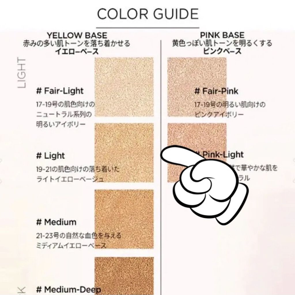- <Fair(本体+リフィル)> 水、シクロペンタシロキサン、酸化チタン、メトキシケイヒ酸エチルヘキシル、トリメチルシロキシケイ酸、サリチル酸エチルヘキシル、グリセリン、PEG-10ジメチコン、BG、エチルヘキサン酸セチル、ナイアシンアミド、ペンチレングリコール、合成フルオロフロゴパイト、カプリリルメチコン、ポリプロピルシルセスキオキサン、(ビニルピロリドン/ヘキサデセン)コポリマー、酸化鉄、硫酸Mg、フェノキシエタノール、セチルPEG/PPG-10/1ジメチコン、ジステアルジモニウムヘクトライト、ステアリン酸、アルミナ、(アクリレーツ/ジメチコン)コポリマー、水酸化Al、トリエトキシカプリリルシラン、ジメチコン、香料、エチルヘキシルグリセリン、ジメチコンクロスポリマー、アデノシン、EDTA-2Na、(ジメチコン/ビニルジメチコン)クロスポリマー、マイカ、酸化スズ、ポリグルタミン酸 <Fair Light(本体+リフィル)> 水、シクロペンタシロキサン、酸化チタン、メトキシケイヒ酸エチルヘキシル、トリメチルシロキシケイ酸、サリチル酸エチルヘキシル、グリセリン、PEG-10ジメチコン、BG、エチルヘキサン酸セチル、ナイアシンアミド、ペンチレングリコール、合成フルオロフロゴパイト、カプリリルメチコン、ポリプロピルシルセスキオキサン、(ビニルピロリドン/ヘキサデセン)コポリマー、酸化鉄、硫酸Mg、フェノキシエタノール、セチルPEG/PPG-10/1ジメチコン、ジステアルジモニウムヘクトライト、ステアリン酸、アルミナ、(アクリレーツ/ジメチコン)コポリマー、水酸化Al、トリエトキシカプリリルシラン、ジメチコン、香料、エチルヘキシルグリセリン、ジメチコンクロスポリマー、アデノシン、EDTA-2Na、(ジメチコン/ビニルジメチコン)クロスポリマー、マイカ、酸化スズ、ポリグルタミン酸 <Fair pink(本体+リフィル)> 水、シクロペンタシロキサン、酸化チタン、メトキシケイヒ酸エチルヘキシル、トリメチルシロキシケイ酸、サリチル酸エチルヘキシル、グリセリン、PEG-10ジメチコン、BG、エチルヘキサン酸セチル、ナイアシンアミド、ペンチレングリコール、合成フルオロフロゴパイト、カプリリルメチコン、ポリプロピルシルセスキオキサン、(ビニルピロリドン/ヘキサデセン)コポリマー、酸化鉄、硫酸Mg、フェノキシエタノール、セチルPEG/PPG-10/1ジメチコン、ジステアルジモニウムヘクトライト、ステアリン酸、アルミナ、(アクリレーツ/ジメチコン)コポリマー、水酸化Al、トリエトキシカプリリルシラン、ジメチコン、香料、エチルヘキシルグリセリン、ジメチコンクロスポリマー、アデノシン、EDTA-2Na、(ジメチコン/ビニルジメチコン)クロスポリマー、マイカ、酸化スズ、ポリグルタミン酸 <pink Light(本体+リフィル)> 水、シクロペンタシロキサン、酸化チタン、メトキシケイヒ酸エチルヘキシル、トリメチルシロキシケイ酸、サリチル酸エチルヘキシル、グリセリン、PEG-10ジメチコン、BG、エチルヘキサン酸セチル、ナイアシンアミド、ペンチレングリコール、合成フルオロフロゴパイト、カプリリルメチコン、ポリプロピルシルセスキオキサン、(ビニルピロリドン/ヘキサデセン)コポリマー、酸化鉄、硫酸Mg、フェノキシエタノール、セチルPEG/PPG-10/1ジメチコン、ジステアルジモニウムヘクトライト、ステアリン酸、アルミナ、(アクリレーツ/ジメチコン)コポリマー、水酸化Al、トリエトキシカプリリルシラン、ジメチコン、香料、エチルヘキシルグリセリン、ジメチコンクロスポリマー、アデノシン、EDTA-2Na、(ジメチコン/ビニルジメチコン)クロスポリマー、マイカ、酸化スズ、ポリグルタミン酸 <Light(本体+リフィル)> 水、シクロペンタシロキサン、酸化チタン、メトキシケイヒ酸エチルヘキシル、トリメチルシロキシケイ酸、サリチル酸エチルヘキシル、グリセリン、PEG-10ジメチコン、BG、エチルヘキサン酸セチル、ナイアシンアミド、ペンチレングリコール、合成フルオロフロゴパイト、カプリリルメチコン、ポリプロピルシルセスキオキサン、(ビニルピロリドン/ヘキサデセン)コポリマー、酸化鉄、硫酸Mg、フェノキシエタノール、セチルPEG/PPG-10/1ジメチコン、ジステアルジモニウムヘクトライト、ステアリン酸、アルミナ、(アクリレーツ/ジメチコン)コポリマー、水酸化Al、トリエトキシカプリリルシラン、ジメチコン、香料、エチルヘキシルグリセリン、ジメチコンクロスポリマー、アデノシン、EDTA-2Na、(ジメチコン/ビニルジメチコン)クロスポリマー、マイカ、酸化スズ、ポリグルタミン酸 <Medium(本体+リフィル)> 水、シクロペンタシロキサン、酸化チタン、メトキシケイヒ酸エチルヘキシル、トリメチルシロキシケイ酸、サリチル酸エチルヘキシル、グリセリン、PEG-10ジメチコン、BG、エチルヘキサン酸セチル、ナイアシンアミド、ペンチレングリコール、合成フルオロフロゴパイト、カプリリルメチコン、ポリプロピルシルセスキオキサン、(ビニルピロリドン/ヘキサデセン)コポリマー、酸化鉄、硫酸Mg