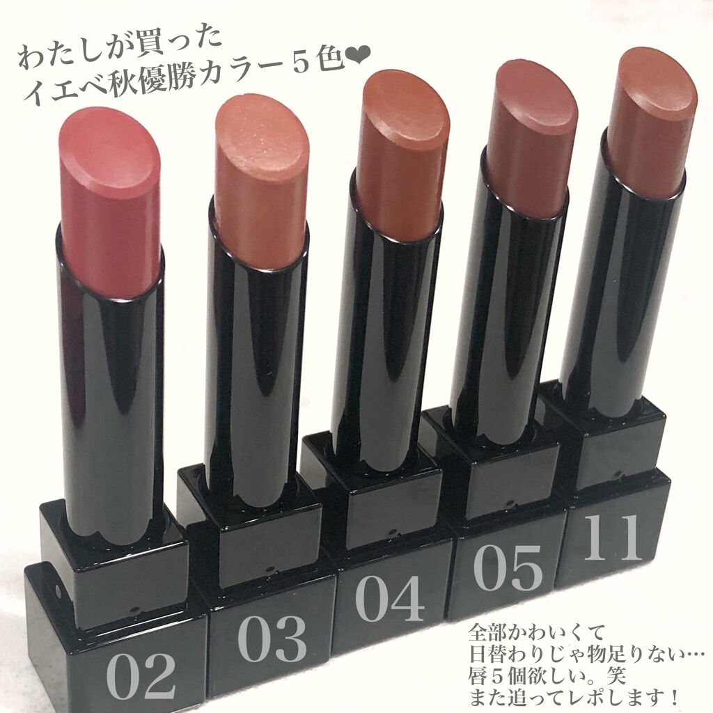 - <01 欲望の塊> テトライソステアリン酸ジペンタエリスリチル、トリ(カプリル酸/カプリン酸)グリセリル、オクチルドデカノール、ラウロイルグルタミン酸ジ(フィトステリル/オクチルドデシル)、ビスアルキル(C16-18)グリセリルウンデシルジメチコン、イソノナン酸イソトリデシル、水添ポリイソブテン、ラウロイルグルタミン酸ジ(オクチルドデシル/フィトステリル/ベヘニル)、パラフィン、合成ワックス、ダイマージリノール酸(フィトステリル/イソステアリル/セチル/ステアリル/ベヘニル)、マイクロクリスタリンワックス、水添マイクロクリスタリンワックス、ヒドロキシステアリン酸エチルヘキシル、トコフェロール、ホホバ種子油、オリーブ果実油、アーモンド油、(エチレン/プロピレン)コポリマー、ポリエチレン、ジメチコン、(+/-)(チタン/酸化チタン)焼結物、マイカ、ラウロイルアスパラギン酸Na、ラウロイルリシン、塩化亜鉛、酸化チタン、酸化鉄、水酸化Al、硫酸Ba、トリイソステアリン酸イソプロピルチタン、酸化スズ、ホウケイ酸(Ca/Al)、合成フルオロフロゴパイト、黄4、黄5、赤104(1)、赤201、赤202 <02 ピンクバナナ> テトライソステアリン酸ジペンタエリスリチル、トリ(カプリル酸/カプリン酸)グリセリル、オクチルドデカノール、ラウロイルグルタミン酸ジ(フィトステリル/オクチルドデシル)、ビスアルキル(C16-18)グリセリルウンデシルジメチコン、イソノナン酸イソトリデシル、水添ポリイソブテン、ラウロイルグルタミン酸ジ(オクチルドデシル/フィトステリル/ベヘニル)、パラフィン、合成ワックス、ダイマージリノール酸(フィトステリル/イソステアリル/セチル/ステアリル/ベヘニル)、マイクロクリスタリンワックス、水添マイクロクリスタリンワックス、ヒドロキシステアリン酸エチルヘキシル、トコフェロール、ホホバ種子油、オリーブ果実油、アーモンド油、(エチレン/プロピレン)コポリマー、ポリエチレン、ジメチコン、(+/-)(チタン/酸化チタン)焼結物、マイカ、ラウロイルアスパラギン酸Na、ラウロイルリシン、塩化亜鉛、酸化チタン、酸化鉄、水酸化Al、硫酸Ba、トリイソステアリン酸イソプロピルチタン、酸化スズ、ホウケイ酸(Ca/Al)、合成フルオロフロゴパイト、黄4、黄5、赤104(1)、赤201、赤202 <03 陽炎> テトライソステアリン酸ジペンタエリスリチル、トリ(カプリル酸/カプリン酸)グリセリル、オクチルドデカノール、ラウロイルグルタミン酸ジ(フィトステリル/オクチルドデシル)、ビスアルキル(C16-18)グリセリルウンデシルジメチコン、イソノナン酸イソトリデシル、水添ポリイソブテン、ラウロイルグルタミン酸ジ(オクチルドデシル/フィトステリル/ベヘニル)、パラフィン、合成ワックス、ダイマージリノール酸(フィトステリル/イソステアリル/セチル/ステアリル/ベヘニル)、マイクロクリスタリンワックス、水添マイクロクリスタリンワックス、ヒドロキシステアリン酸エチルヘキシル、トコフェロール、ホホバ種子油、オリーブ果実油、アーモンド油、(エチレン/プロピレン)コポリマー、ポリエチレン、ジメチコン、(+/-)(チタン/酸化チタン)焼結物、マイカ、ラウロイルアスパラギン酸Na、ラウロイルリシン、塩化亜鉛、酸化チタン、酸化鉄、水酸化Al、硫酸Ba、トリイソステアリン酸イソプロピルチタン、酸化スズ、ホウケイ酸(Ca/Al)、合成フルオロフロゴパイト、黄4、黄5、赤104(1)、赤201、赤202 <04 パンプキンワイン> テトライソステアリン酸ジペンタエリスリチル、トリ(カプリル酸/カプリン酸)グリセリル、オクチルドデカノール、ラウロイルグルタミン酸ジ(フィトステリル/オクチルドデシル)、ビスアルキル(C16-18)グリセリルウンデシルジメチコン、イソノナン酸イソトリデシル、水添ポリイソブテン、ラウロイルグルタミン酸ジ(オクチルドデシル/フィトステリル/ベヘニル)、パラフィン、合成ワックス、ダイマージリノール酸(フィトステリル/イソステアリル/セチル/ステアリル/ベヘニル)、マイクロクリスタリンワックス、水添マイクロクリスタリンワックス、ヒドロキシステアリン酸エチルヘキシル、トコフェロール、ホホバ種子油、オリーブ果実油、アーモンド油、(エチレン/プロピレン)コポリマー、ポリエチレン、ジメチコン、(+/-)(チタン/酸化チタン)焼結物、マイカ、ラウロイルアスパラギン酸Na、ラウロイルリシン、塩化亜鉛、酸化チタン、酸化鉄、水酸化Al、硫酸Ba、トリイソステアリン酸イソプロピルチタン、酸化スズ、ホウケイ酸(Ca/Al)、合成フルオロフロゴパイト、黄4、黄5、赤104(1)、赤201、赤202 <05 ダークフィグ> テトライソステアリン酸ジペンタエリスリチル、トリ(カプリル酸/カプリン酸)グリセリル、オクチルドデカノール、ラウロイルグルタミン酸ジ(フィトステリル/オクチルドデシル)、ビスアルキル(C16-18)グリセリルウンデシルジメチコン、イソノナン酸イソトリデシル、水添ポリイソブテン、ラウロイルグルタミン酸ジ(オクチルドデシル/フィトステリル/ベヘニル)、