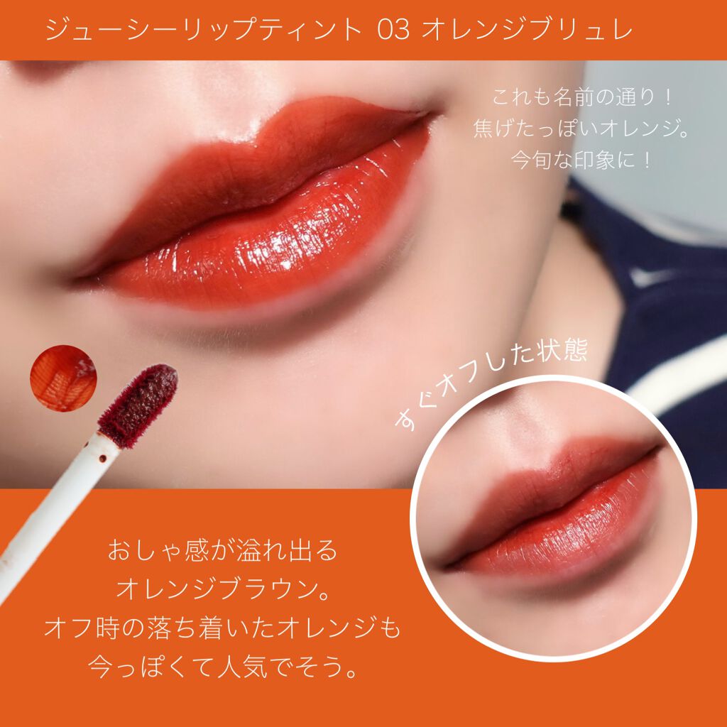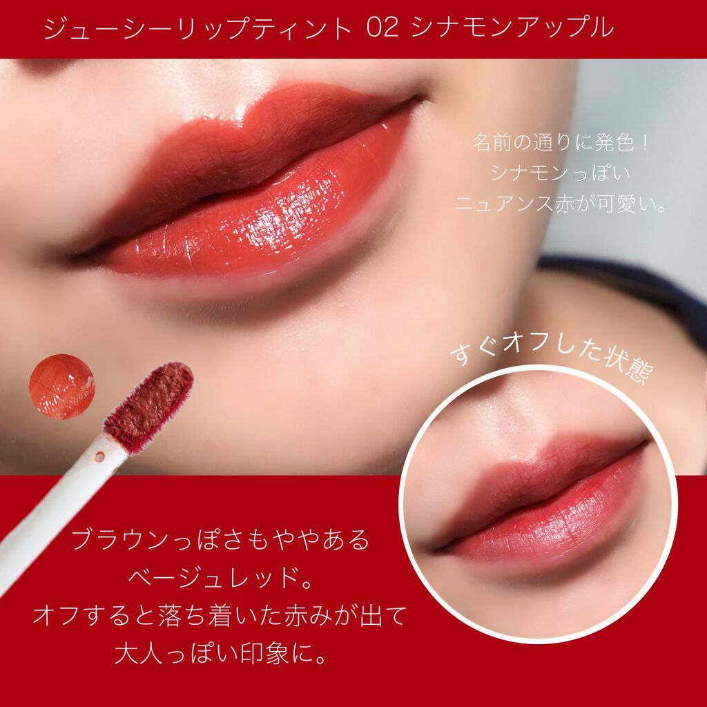 - ツヤ膜でLIPカラーを閉じ込める 塗ってから「5分」でかわいい唇完成♥ツヤがあふれ出るオイルinウォーターティント 水に対して約2倍のオイル成分を配合した「オイルinウォーター処方」 時間経過でツヤ膜がじゅわ~っとあふれ出し、 まるでグロスを重ねたような仕上がりに。みずみずしいツヤ感が持続します。 塗布後、時間経過(※)で色が定着して食べても飲んでも血色長持ち。 (※定着には個人差があります。弊社5分推奨) 高密着で唇に溶け込むように色づきます。 コップやペットボトルへの色移りがしにくくなります。