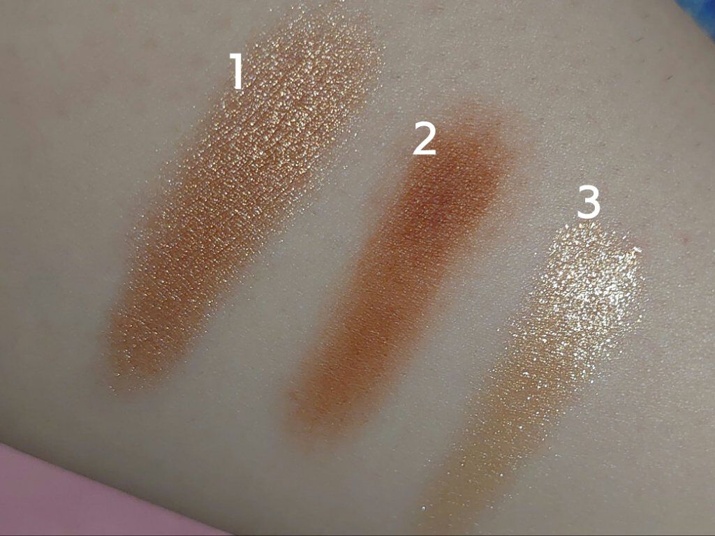 ホリデーメイクを引き立てるツヤ美肌をつくる、3色のフェイスパウダーセット 華やかな輝きを演出するエクストラディメンションのブロンザー、ブラッシュ、ハイライトが1つに詰まったホリデーフェイスづくりのためのパレット オレンジのパールで細かいシルバーラメが綺麗✨ ピンク、パープルの偏光色で光の具合でゴールドの色に😍🎉 黄みが強いソフトブラウンマット どちらも綺麗なのですが、ピンクの偏光色の②がかなりオススメです🥳❤️❤️❤️