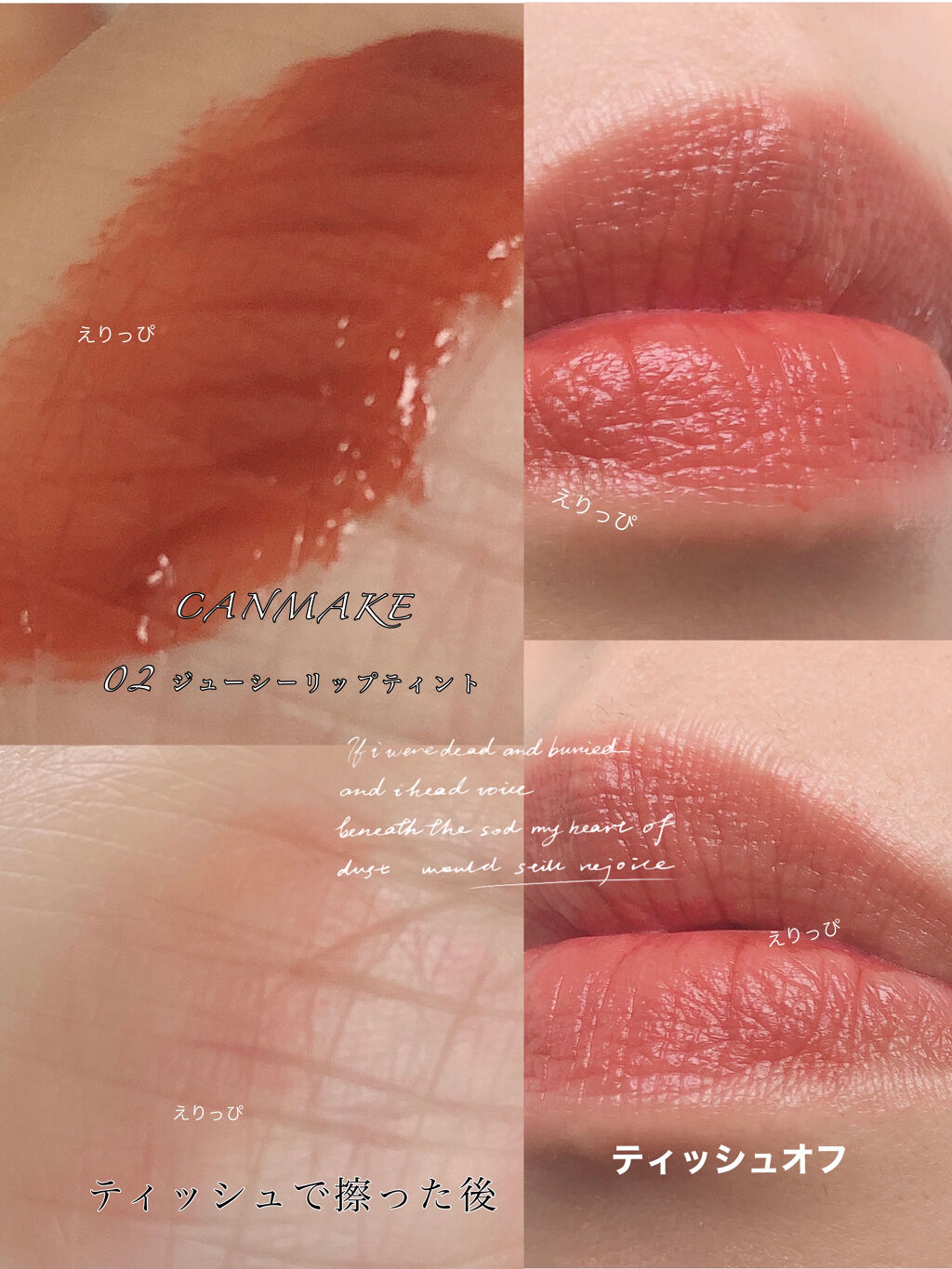 - ツヤ膜でLIPカラーを閉じ込める 塗ってから「5分」でかわいい唇完成♥ツヤがあふれ出るオイルinウォーターティント 水に対して約2倍のオイル成分を配合した「オイルinウォーター処方」 時間経過でツヤ膜がじゅわ~っとあふれ出し、 まるでグロスを重ねたような仕上がりに。みずみずしいツヤ感が持続します。 塗布後、時間経過(※)で色が定着して食べても飲んでも血色長持ち。 (※定着には個人差があります。弊社5分推奨) 高密着で唇に溶け込むように色づきます。 コップやペットボトルへの色移りがしにくくなります。