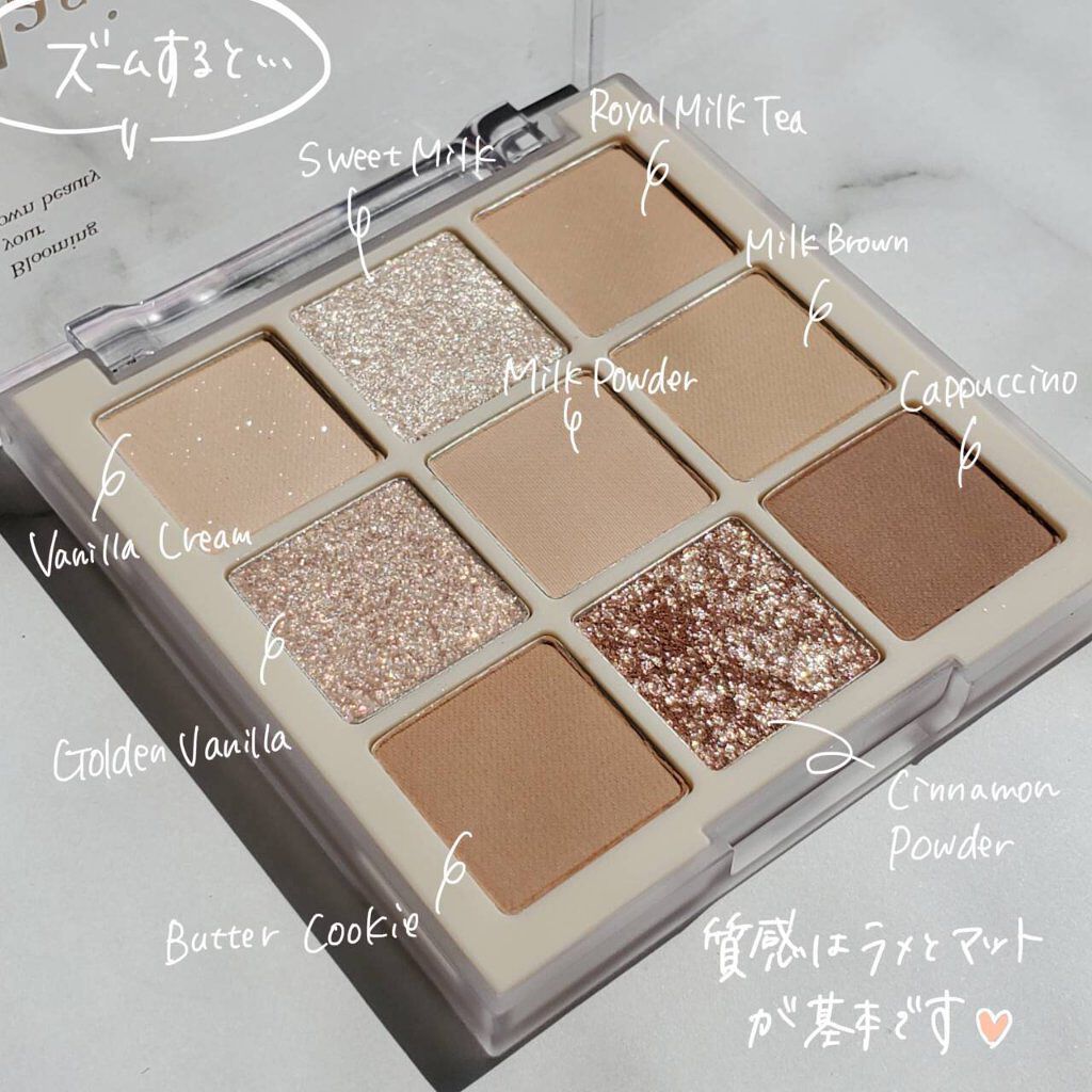 デイジークのミニシャドウパレットミルクラテは約5cm四方のちっちゃな可愛いパレット🤍🤎名前の通りミルクっぽい甘いブラウンカラーのアイシャドウでイマドキの目元が作れる🥛🫧ラメも大粒ギラッギラで可愛いしマットカラーだけで仕上げても最高👏🏻モカムー...