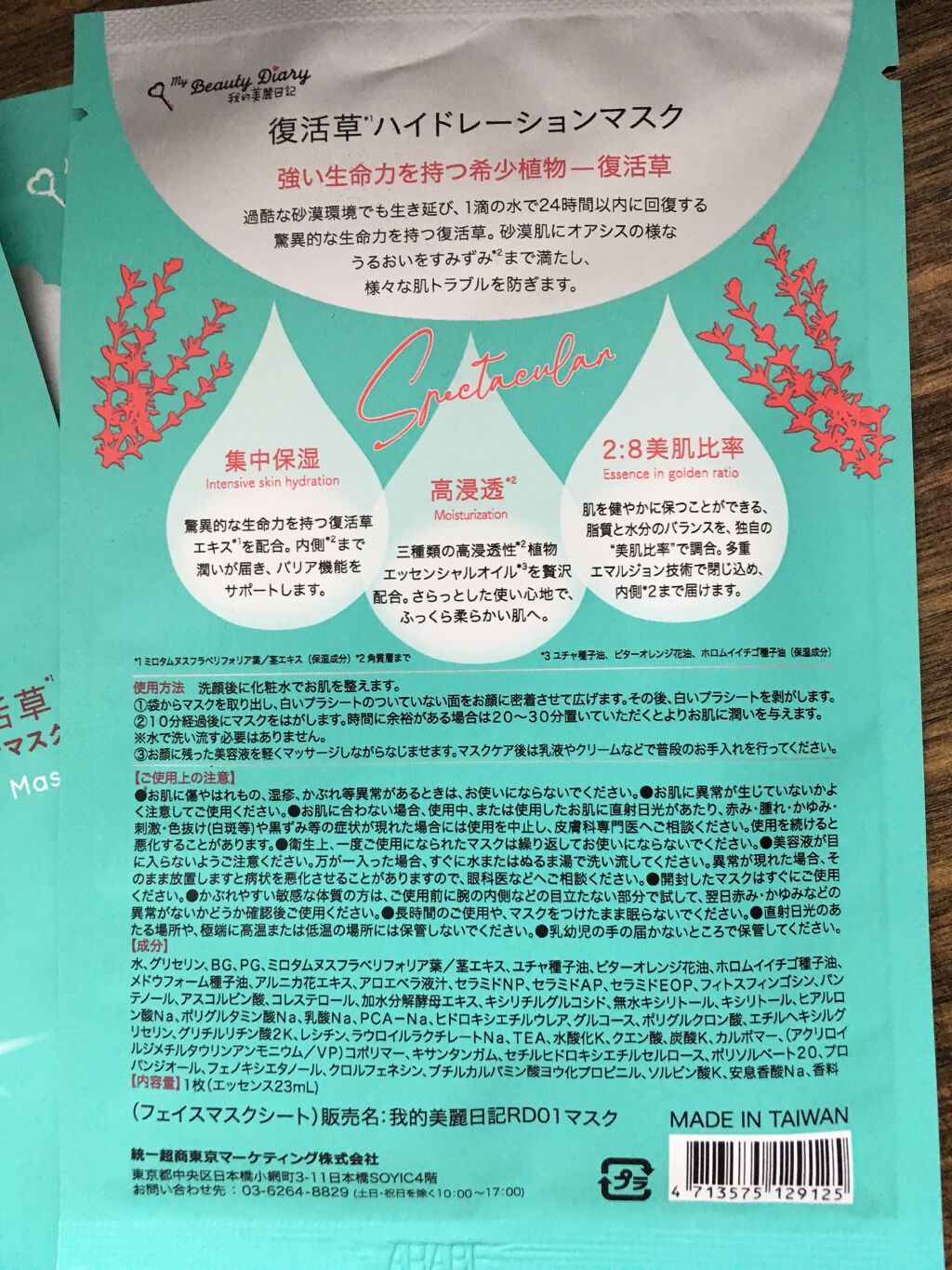 #購入品台湾コスメの我的美麗日記(私のキレイ日記)のシートマスクを使ってみました☺️✨『復活草ハイドレーションマスク』3枚入748円強い生命力を持つ希少植物「復活草」に着目した保湿シートマスク💧✨さらに3種のセラミドとビタミンC誘導体などを配...