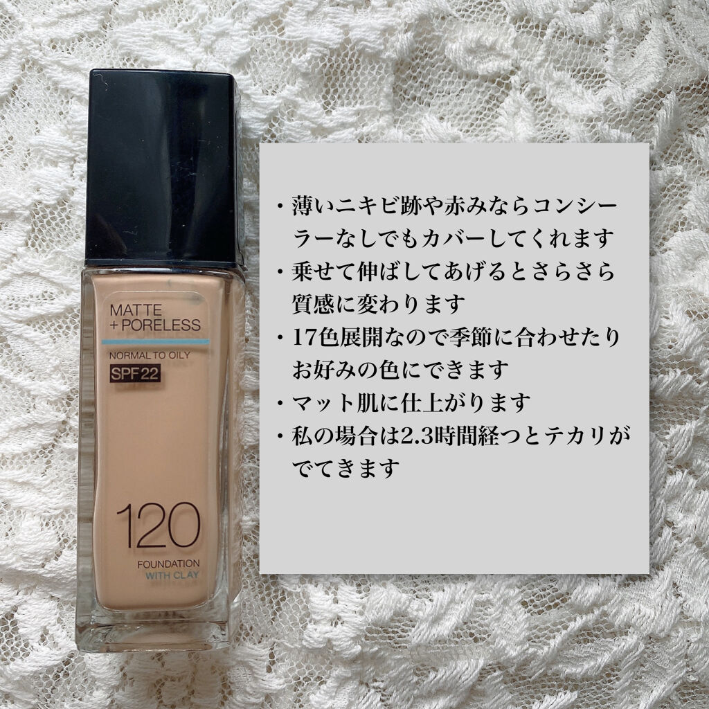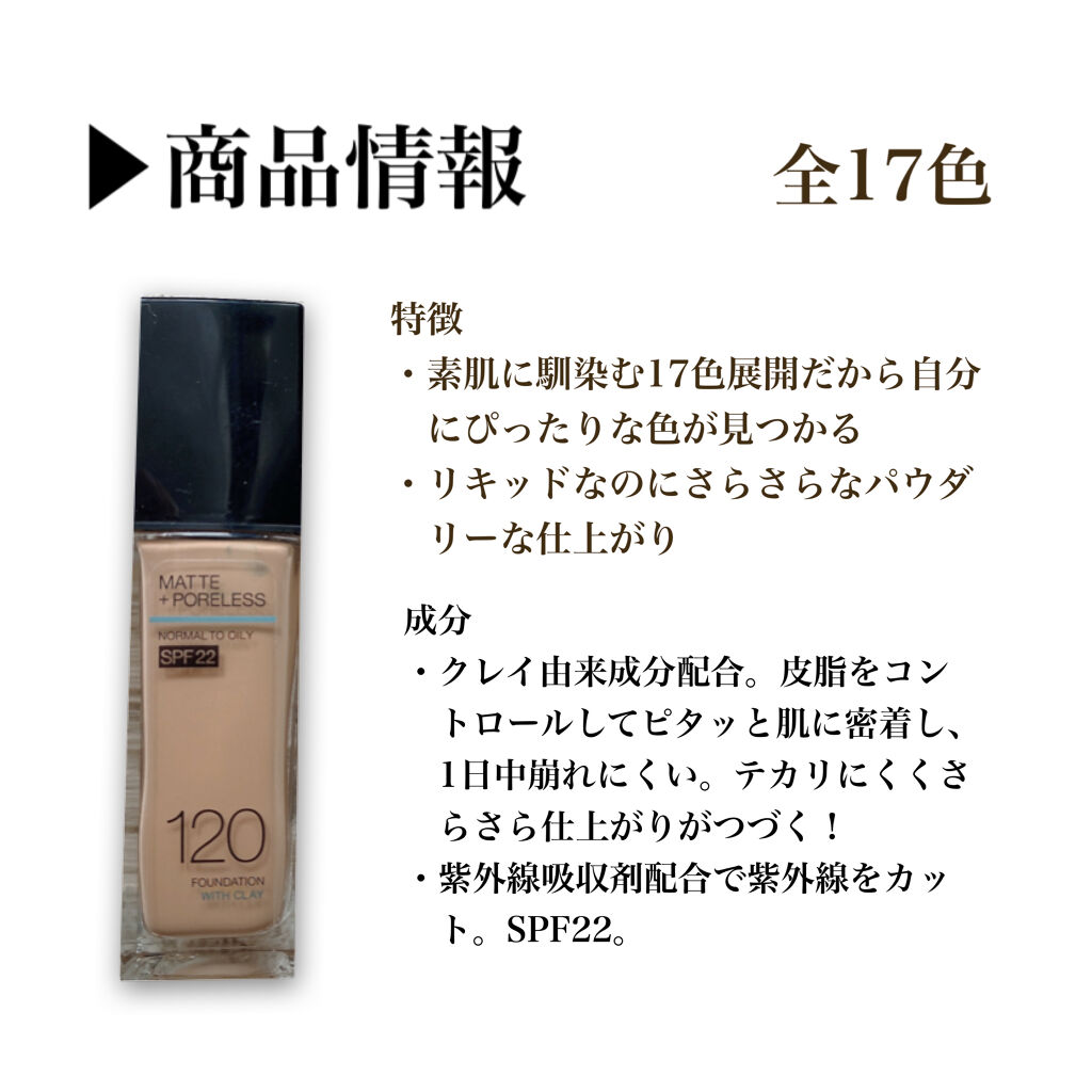 - 肌に溶け込むようになじんで、まるで素肌のような仕上がりのリキッドファンデーション。豊富なカラーバリエーションで妥協なく自分にぴったりの色が見つかります。エアロジェル*1を配合。油分を吸収してしっかり密着、崩れにくいのにうるおい感は残すので長時間心地よい*3。パウダーいらずで、夜までテカらないさらさら仕上がりが続きます。SPF22配合で夏の日差しにも。しっかりUVケアできます。 さらに肌に優しい! -ニキビができにくい処方(ノンコメドジェニックテスト済)*3 -皮膚科医協力のもとテスト済*4 -アレルギーテスト済*4 *1シリル化シリカ(油分吸収成分) *2 メイベリン ニューヨーク調べ。個人差があります。 *3すべての方にコメド(ニキビのもと)が発生しないというわけではありません。 *4すべての方に肌トラブルがおこらないというわけではありません。