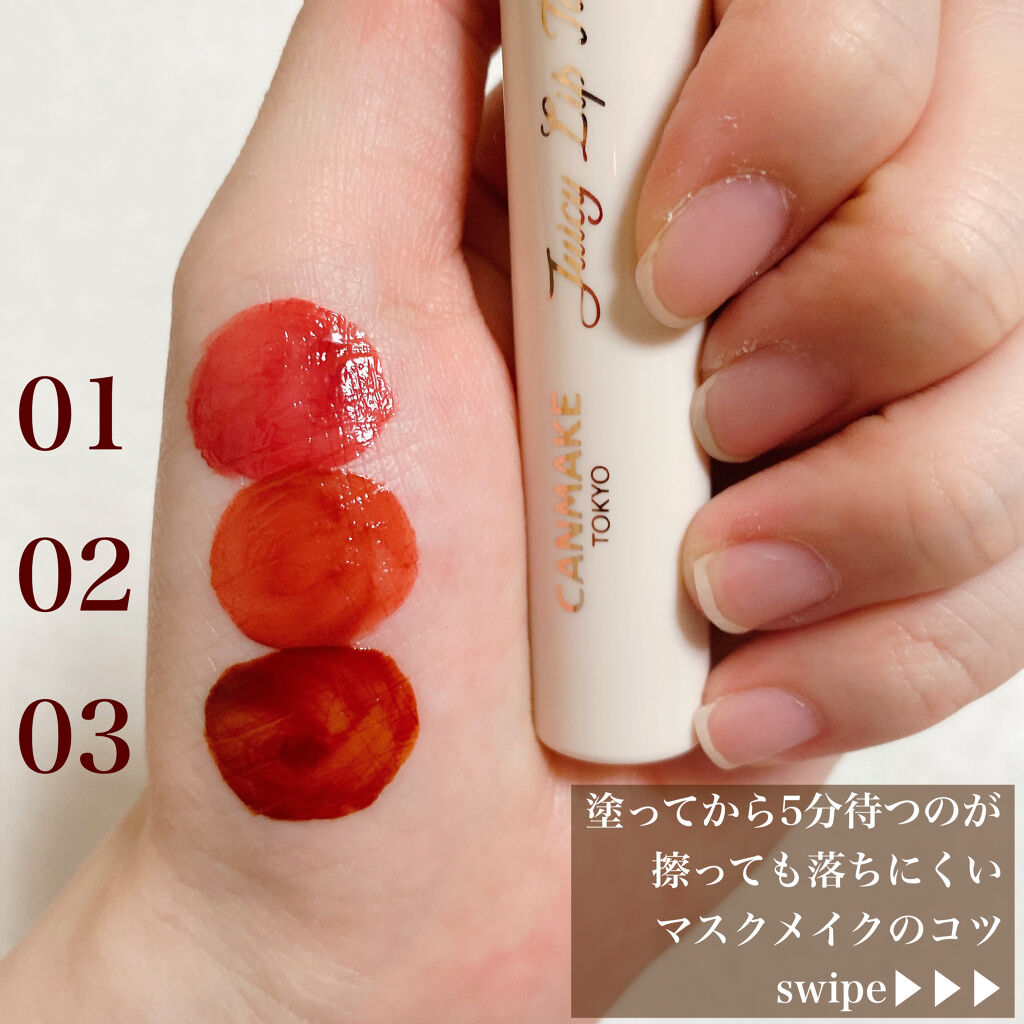 - ツヤ膜でLIPカラーを閉じ込める 塗ってから「5分」でかわいい唇完成♥ツヤがあふれ出るオイルinウォーターティント 水に対して約2倍のオイル成分を配合した「オイルinウォーター処方」 時間経過でツヤ膜がじゅわ~っとあふれ出し、 まるでグロスを重ねたような仕上がりに。みずみずしいツヤ感が持続します。 塗布後、時間経過(※)で色が定着して食べても飲んでも血色長持ち。 (※定着には個人差があります。弊社5分推奨) 高密着で唇に溶け込むように色づきます。 コップやペットボトルへの色移りがしにくくなります。
