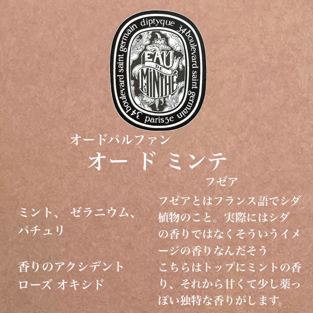 甘ずっぱくてみずみずしいイチジクの香り。ディプティックのイチジクをイメージした香り、Philosykos(フィロシコス)。ギリシャ語で「イチジクの友」という意味らしいです。 甘すぎず、フルーティー過ぎない、なかなか人と被らない香りで、年中通して爽やかにつけれます。 販売員のお兄さんいわく、高級ホテルのアメニティにも採用されている香りだそうです。