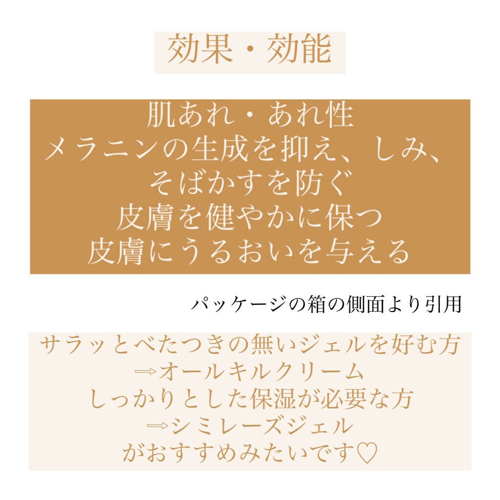 - メラニンの生成を抑え、 日焼けによるシミそばかすを防ぐことを認められた医薬部外品。 ビタミンCが主成分で全6種類のビタミンが入ったビタミンオールインワンジェルです。オールキルクリームの2.5倍のビタミンが配合されたグレードアップ版。