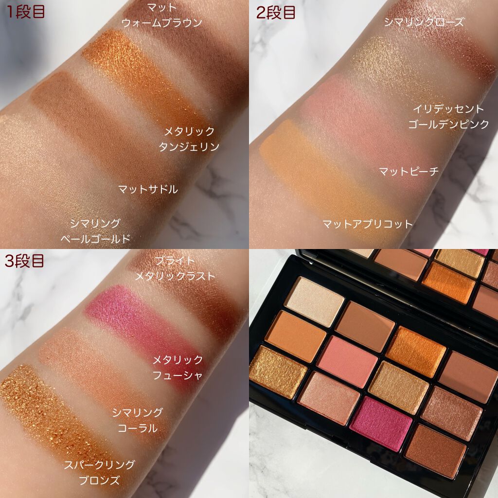 - [数量限定] マット、サテン、シアー、メタリックの質感であたたかみのある12シェードの限定アイシャドーパレット。ポップな⾊合いにテクスチャーのバリエーションで想像を超える仕上がりをもたらします。⾰新的リキッドバインディングシステムが、信じられないほどのリッチで鮮やかな発⾊を可能にします。このパレットひとつでナチュラルなルックから⼤胆なルックまでマルチにクリエイトすることができます。 *リキッドバインディングシステム:パウダーとリキッドを混合し、プレストしたもの。NARSのこれまでのパウダーをプレストしただけのものに⽐べ、なめらかさや肌への密着感、発⾊を⾼めます。