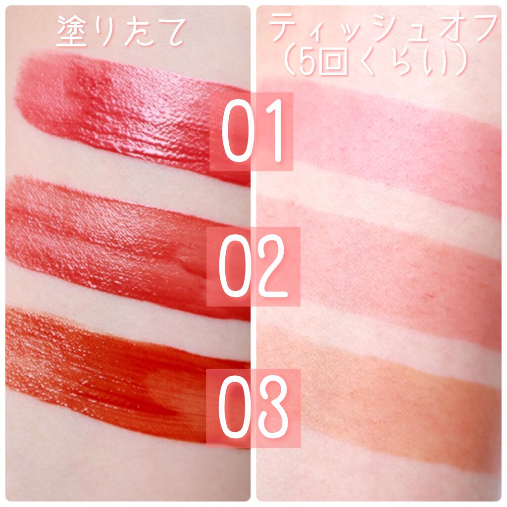 - ツヤ膜でLIPカラーを閉じ込める 塗ってから「5分」でかわいい唇完成♥ツヤがあふれ出るオイルinウォーターティント 水に対して約2倍のオイル成分を配合した「オイルinウォーター処方」 時間経過でツヤ膜がじゅわ~っとあふれ出し、 まるでグロスを重ねたような仕上がりに。みずみずしいツヤ感が持続します。 塗布後、時間経過(※)で色が定着して食べても飲んでも血色長持ち。 (※定着には個人差があります。弊社5分推奨) 高密着で唇に溶け込むように色づきます。 コップやペットボトルへの色移りがしにくくなります。