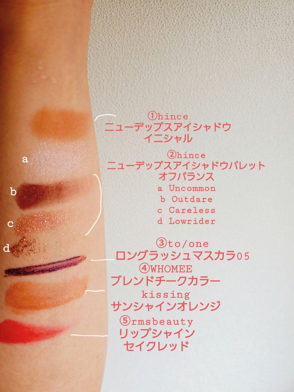 アイブロウは #WHOMEE の#レディモーヴ を使用! #hince の #ニューデップスアイシャドウパレット の a Lowkeyを上瞼全体に馴染ませる。 #rmk の#ザナウナウアイズ 02の #シークレットダスト を目頭に✨ #ヒンス の #ニューアンビエンスカラーマスカラ 上睫毛にブルーの#アンディファインド 下睫毛にオレンジ系の#ライブリー を。 #celvoke の #エンスロールマットリップス 03の テラコッタを💄💋