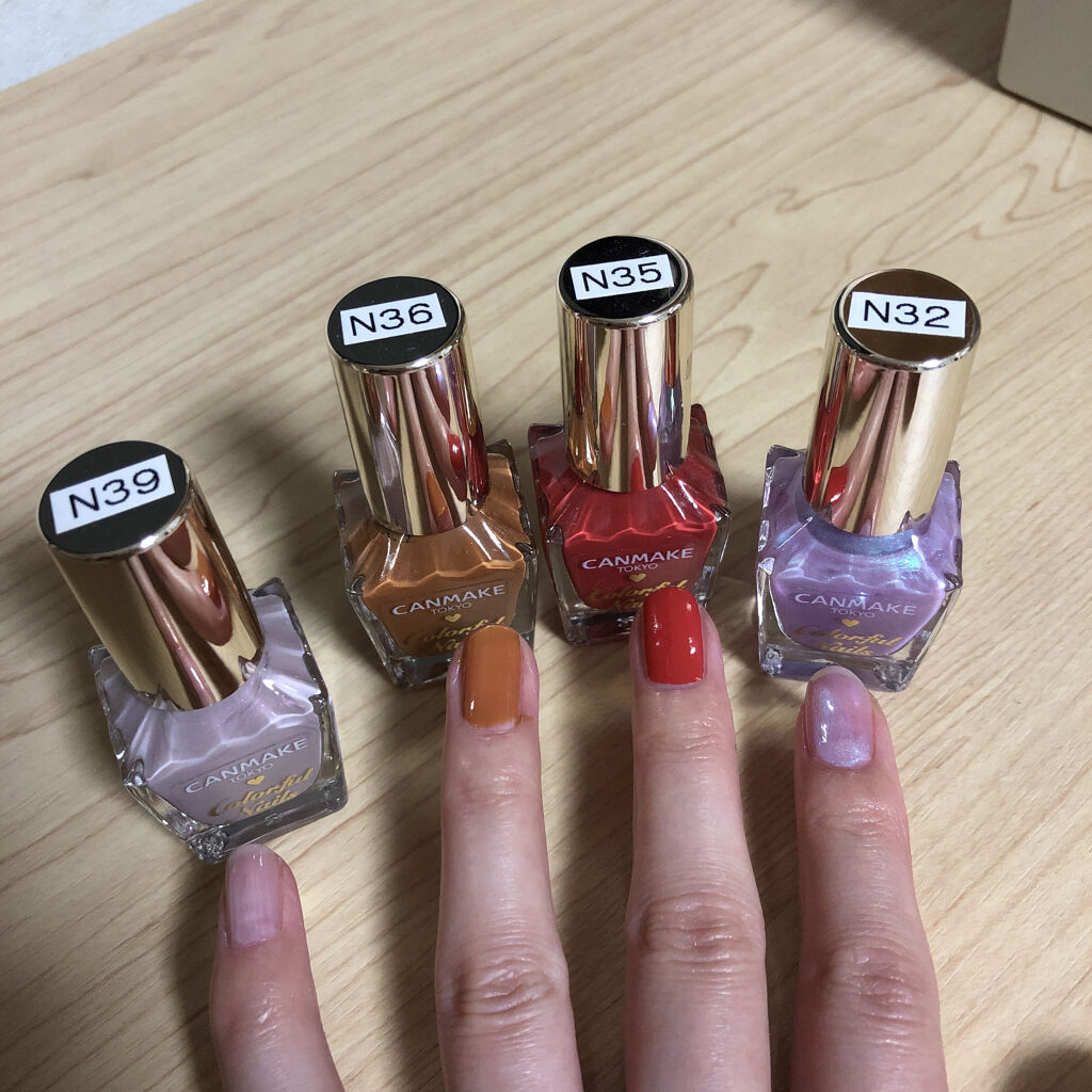 ✔️ベースコート こだわりはないですが、薄いカラーを使うときは透明のベースコートを使用しています。 今回はキャンメイクカラフルネイルズNBC ベースコート(薄いぴんく)を使用しています。 ✔️カラー1回目(基本的に私は2回塗ります) 液は少量で、かすれてもいいので全体に塗ります。 ✔️カラー2回目 液は気持ち多め。ハケの跡が残らないくらいように気をつけて塗ります。 ✔️トップコート 超愛用品ジェルボリュームトップコート これでもかってくらいたっぷり塗ります。 ジェルみたいにぷっくり感をもっと出したかったらトップコートの二度塗りもありですが、わたしはあまり厚すぎるのも乾きぐ遅くなってしまうのでトップは1回にしています♡