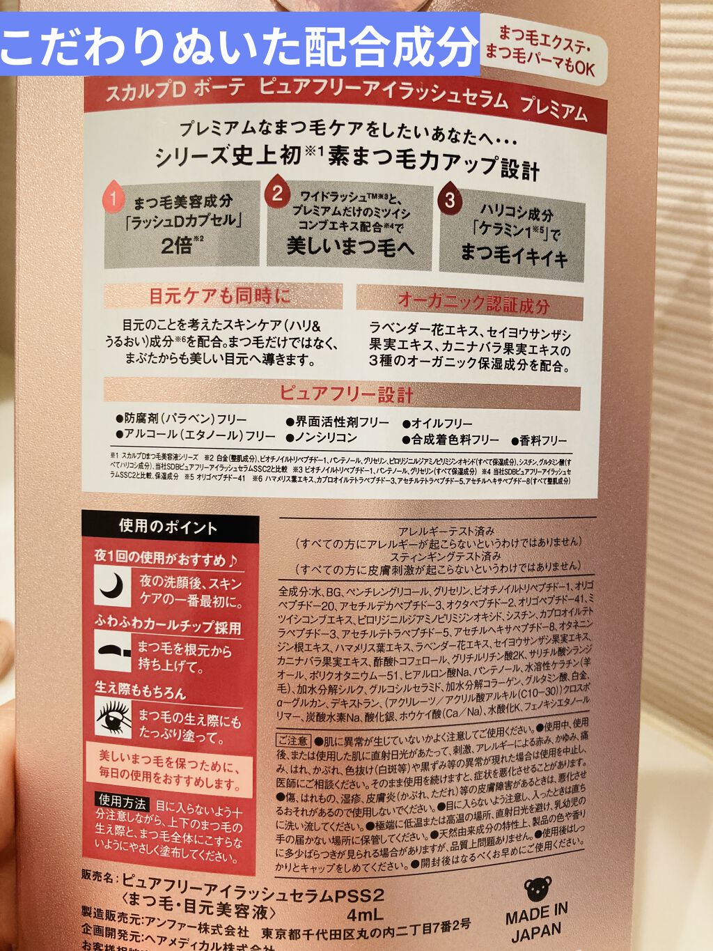 - スカルプDのまつ毛美容液プレミアムは、まつ毛ケア成分を通常品の2倍配合しており、1日1回のケアでもOK♪ さらに、プレミアムには、目元ケア成分配合。まつ毛のハリコシがアップし、上向きカールまつ毛をぐ~んとキープ♪ 使いやすさ・やさしさにこだわった、ふわふわカールチップ採用で根元からも塗りやすく、敏感な目元にやさしい使い心地です。 シリコン、オイル、アルコール(エタノール)、防腐剤(パラベン)、香料、合成着色料、界面活性剤、プロスタグランジン類似物質の8つの成分不使用の“ピュアフリー設計”を実現。 まつ毛エクステ、まつ毛パーマにもご使用いただけます。