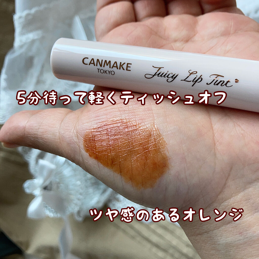 CANMAKE「5分待って」のジューシーリップティントの01番すごく楽しみにしていたので買いました。さすがジューシーな「オイルinウォーター処方」.カサつきがちな唇もホホバ種子オイルや浸透しやすい加水分解コラーゲンでしっとり潤います.グロスの...