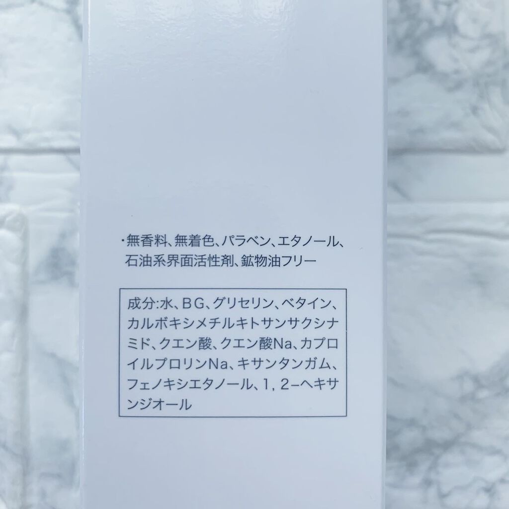 - 水、BG、グリセリン、ベタイン、カルボキシメチルキトサンサクシナミド、クエン酸、クエン酸Na、カプロイルプロリンNa、キサンタンガム、フェノキシエタノール、1,2ーヘキサンジオール