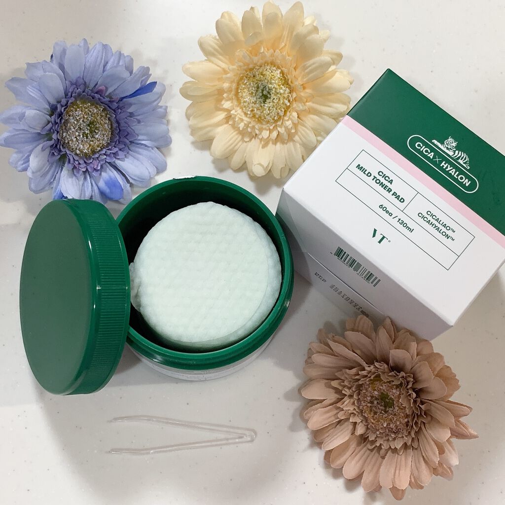 でこぼこのエンボス面で不必要な角質や毛穴汚れなどを拭き取れるトナーパッド! 朝ぬるま湯で顔を洗ってから、メイク前にトナーパットで拭き取るのが大好き🌟 夜のケアだと、赤みやポツポツニキビが気になる部分にパットを抑えて部分用パックとして使うのも好き!! VTのCICAはとにかく肌荒れが気になる時 (赤みやニキビ)に使用するのがおすすめ🌿💚