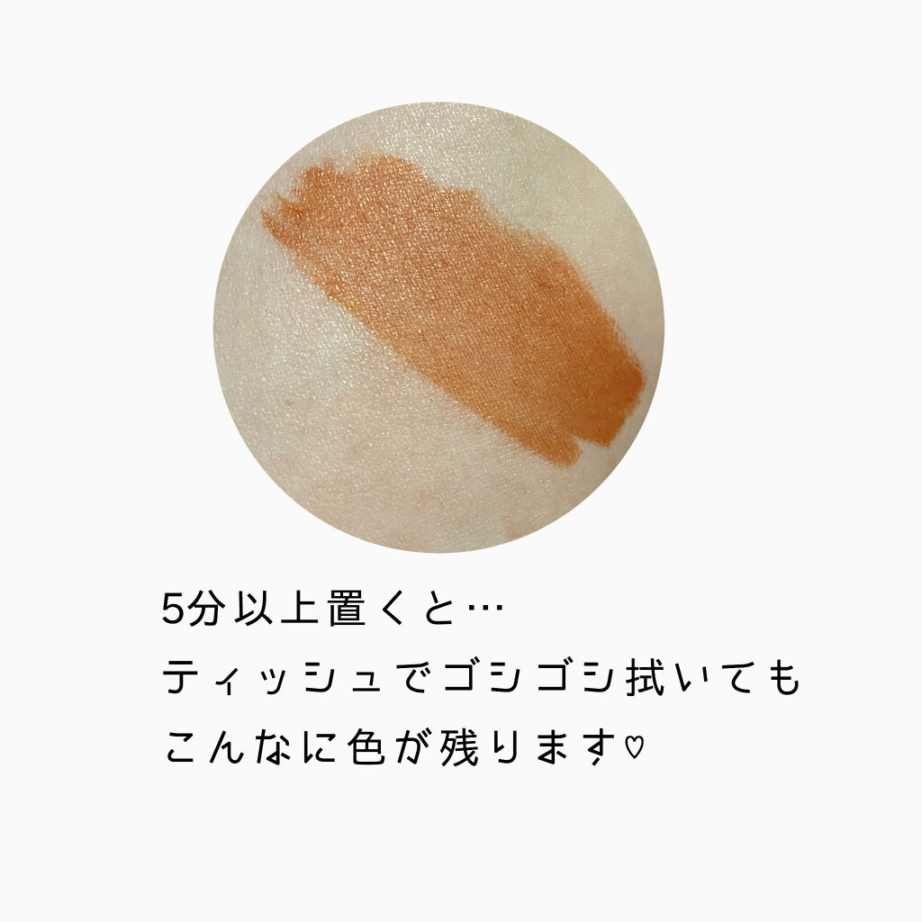 - ツヤ膜でLIPカラーを閉じ込める 塗ってから「5分」でかわいい唇完成♥ツヤがあふれ出るオイルinウォーターティント 水に対して約2倍のオイル成分を配合した「オイルinウォーター処方」 時間経過でツヤ膜がじゅわ~っとあふれ出し、 まるでグロスを重ねたような仕上がりに。みずみずしいツヤ感が持続します。 塗布後、時間経過(※)で色が定着して食べても飲んでも血色長持ち。 (※定着には個人差があります。弊社5分推奨) 高密着で唇に溶け込むように色づきます。 コップやペットボトルへの色移りがしにくくなります。