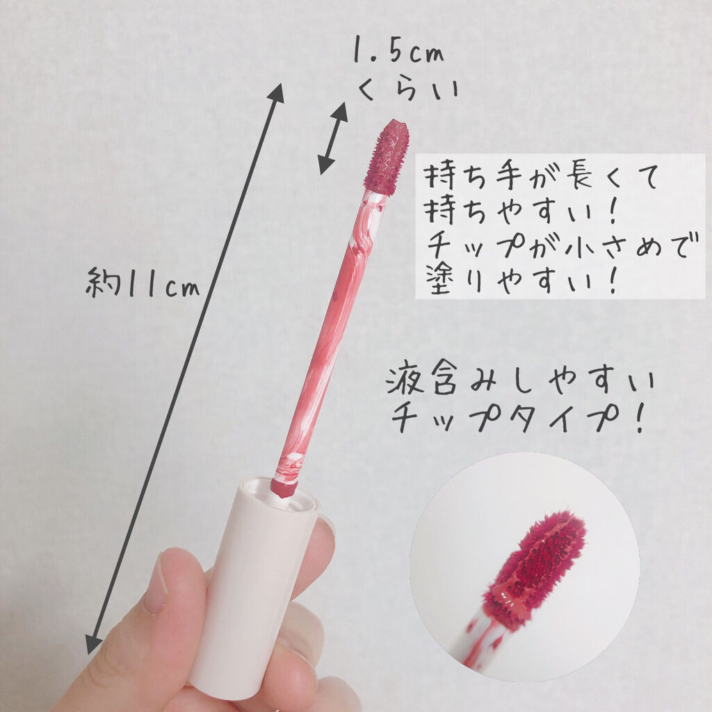 - ツヤ膜でLIPカラーを閉じ込める 塗ってから「5分」でかわいい唇完成♥ツヤがあふれ出るオイルinウォーターティント 水に対して約2倍のオイル成分を配合した「オイルinウォーター処方」 時間経過でツヤ膜がじゅわ~っとあふれ出し、 まるでグロスを重ねたような仕上がりに。みずみずしいツヤ感が持続します。 塗布後、時間経過(※)で色が定着して食べても飲んでも血色長持ち。 (※定着には個人差があります。弊社5分推奨) 高密着で唇に溶け込むように色づきます。 コップやペットボトルへの色移りがしにくくなります。