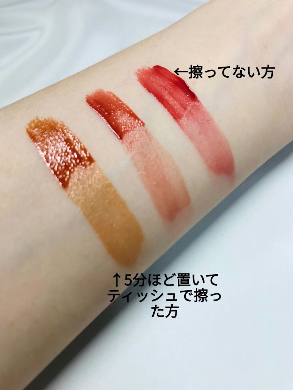全部フルーティな香りがしてティッシュoffしても割と色味が残る!良い!! 容器がプラスチックじゃなかったから高級感があっていい! けど、1回持ち歩いただけで容器に1本の線が……容器が2層になってる感じでヒビが入ったのは外側じゃなくて内側の少ししろい部分だったから中身が漏れるとかはなかった! けどポーチに入れてただけでヒビなんて入ったら持ち運びには不向きなのかな……?って感じ