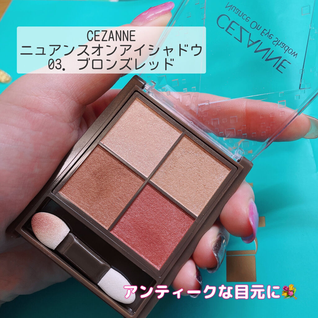 ❤️CEZANNEニュアンスオンアイシャドウ03ブロンズレッド❤️発色は控えめですが、重ねる事で綺麗なツヤ感のあるグラデーションが作れます🙆🏻♀️主張しすぎず、上品な目元に仕上がるアイシャドウです👀💓色味はボルドーっぽいレッドです🥰ラメ飛び...