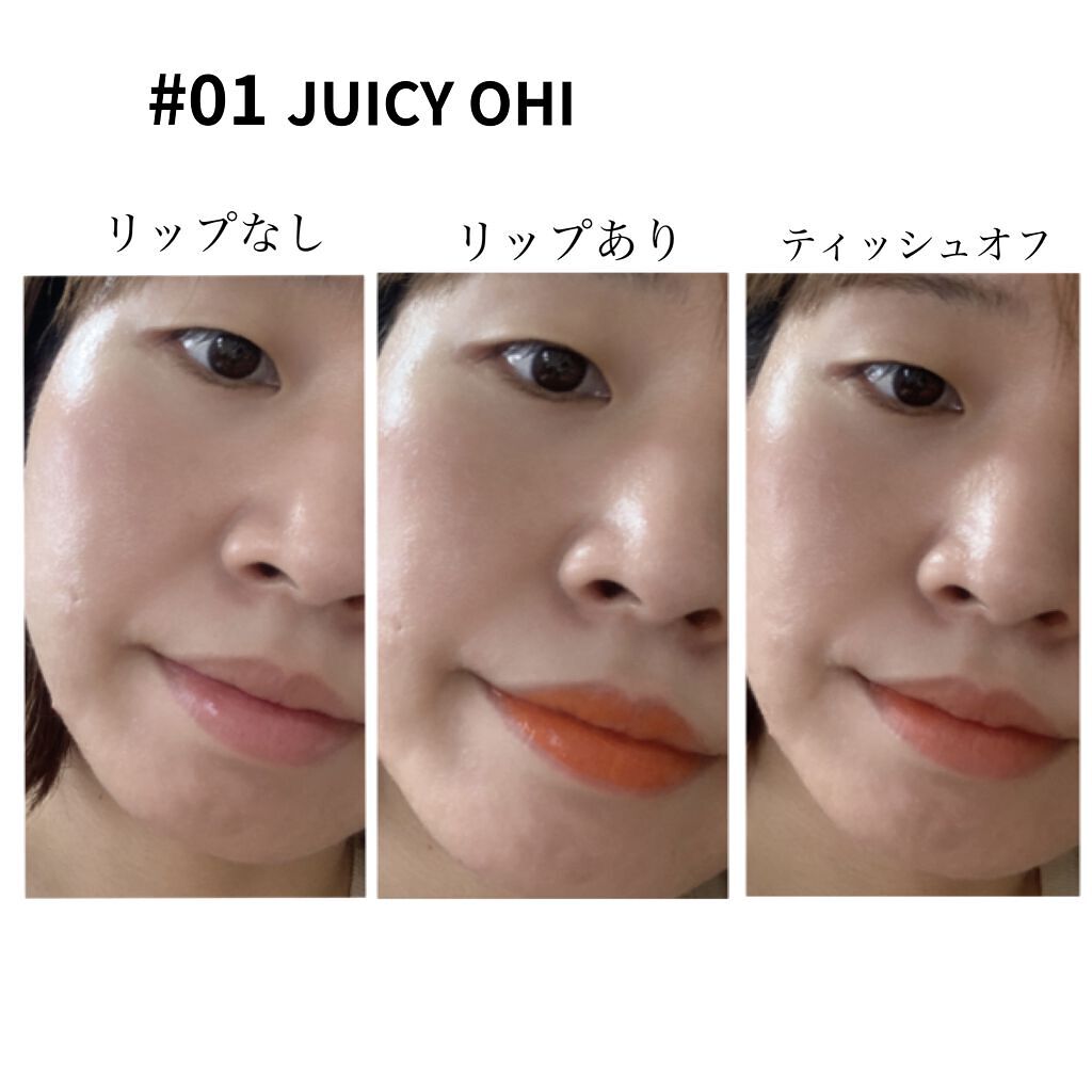 - みずみずしいフルーツがきらめくようなシロップティント ①なめらかで潤いのあるリップを実現 ②果汁のシロップのようなカラー感 ③時間が経つにつれ凸凹を滑らかに密着しボリューム感を演出