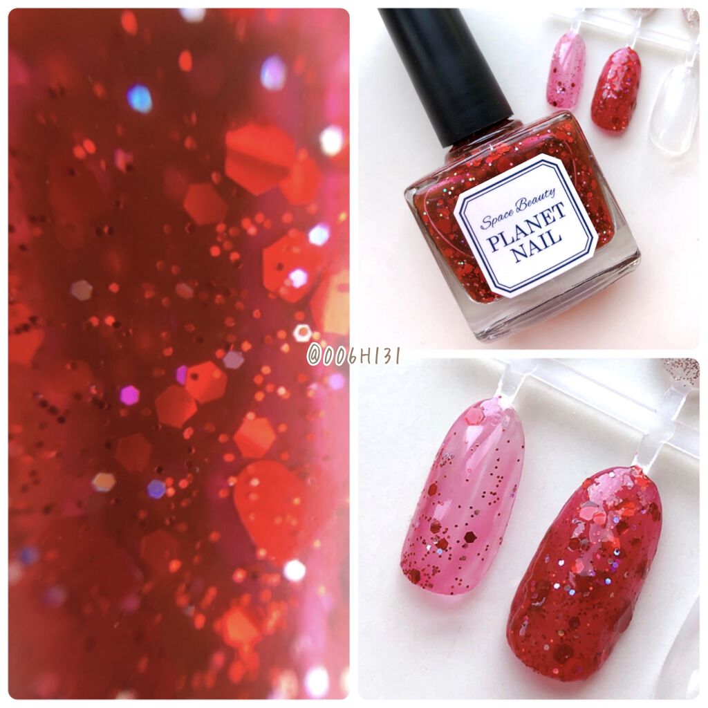 ichigo jamを見た時このバレンタインネイルが絶対したいと思っていたので満足❤ PLB12は赤ベースにハートや大きさの違う六角形ホロが入っていてバレンタインネイルにピッタリ。 シアーなポリッシュなので爪のフリーエッジを目立たせない色つきのベースコートを塗っておくのがおすすめ
