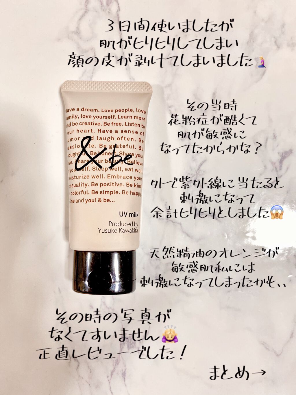【使った商品】&beUVミルク ナチュラルベージュ【商品の特徴】日焼け止め効果SPF50/PA++++石鹸でOFFノンケミカル処方石油系合成界面活性剤不要【良いところ】 少量で伸びの良さフィット感が良い本来の肌に透明感とツヤを与えてくれる【イ...