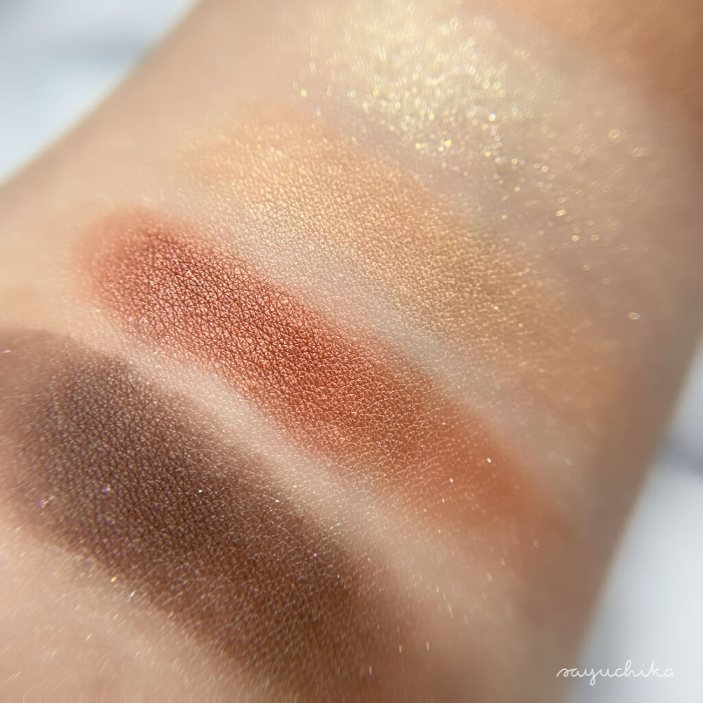 するする伸び広がってしっとりしたつけ心地 全色パール入りでまぶたにツヤ感が出ます。 パケの並び順でまぶたに乗せるだけでグラデアイが作れます。 心奪われるルックスも満点。 パケもエンボスもカラー名も全て花がモチーフになっています。 使ってみて1番好きだったのは04 sunlit ranunculusです。まぶたにパープル、ゴールド、ピンクの組み合わせで乗せるのにハマっています。
