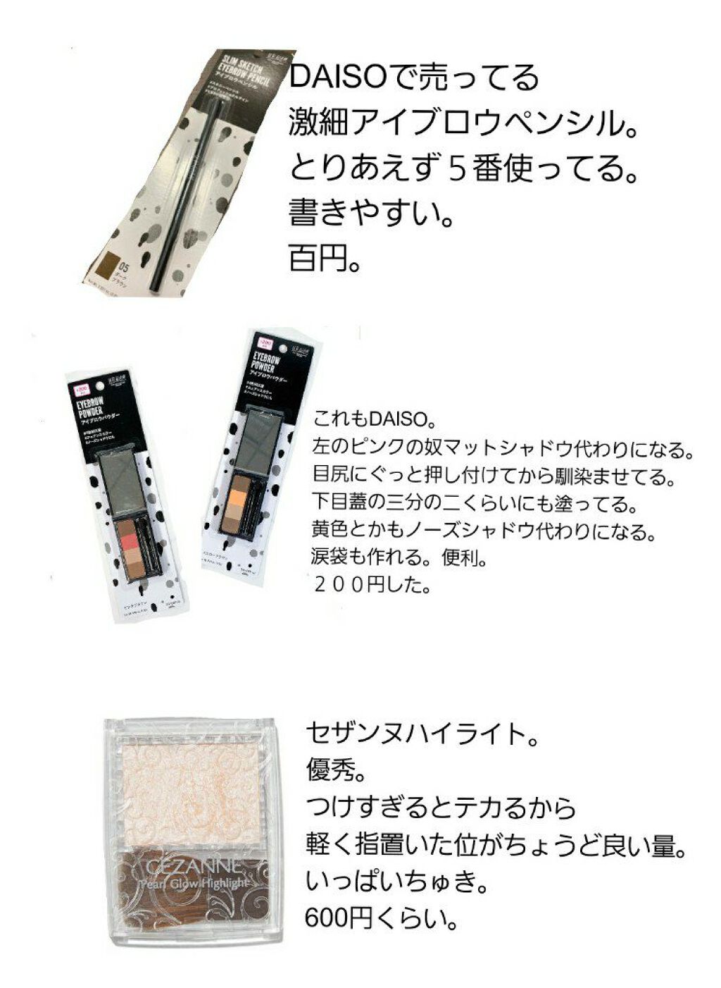 私のおすすめプレゼンを挙げる。参考にして欲しい。安くてかつおしゃれになりたい子向けに作ってみた。最後の四枚目、アイブロウパウダーピンクタイプ、マジでおすすめ。涙袋を書いてから上に重ねると血色感出る。ただノーズシャドウには向いてないから黄色の奴...