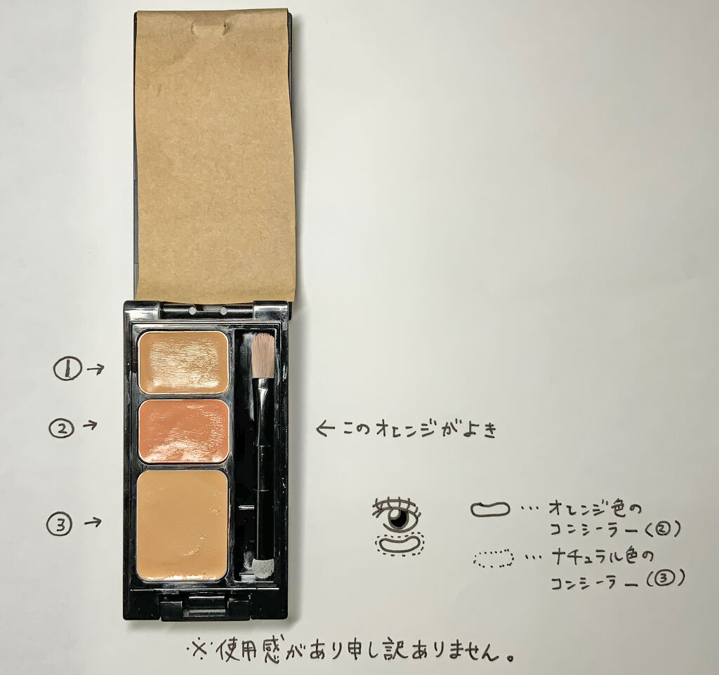 - SPF36 PA+++ シミやクマ、ニキビ跡など隠したいポイントに合わせて自由に色をカスタマイズ出来るコンシーラーパレット。 ナチュラル・オークル・オレンジを組み合わせることで、気になるポイントをより自然にカバー出来ます。 さらに、付属のブラシは筆とスポンジの2wayになっており、広範囲のクマには筆を、シミやニキビ跡などポイント部分にはスポンジと使い分けが可能。 3色×2wayブラシで自由自在に肌色補正が可能です。