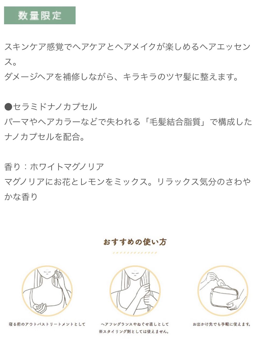 - ダメージケアとキラキラ効果で、いつでもすぐにツヤ髪に。 スキンケア感覚でヘアケアとヘアメイクが楽しめるヘアエッセンス。 ダメージヘアを補修しながら、キラキラのツヤ髪に整えます。 ●セラミドナノカプセル パーマやヘアカラーなどで失われる「毛髪結合脂質」で構成したナノカプセルを配合。