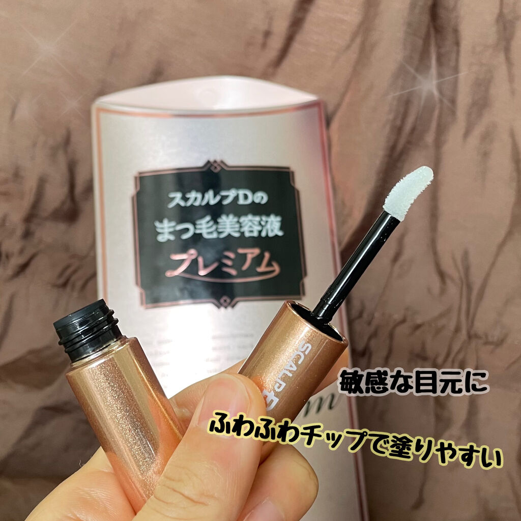 - スカルプDのまつ毛美容液プレミアムは、まつ毛ケア成分を通常品の2倍配合しており、1日1回のケアでもOK♪ さらに、プレミアムには、目元ケア成分配合。まつ毛のハリコシがアップし、上向きカールまつ毛をぐ~んとキープ♪ 使いやすさ・やさしさにこだわった、ふわふわカールチップ採用で根元からも塗りやすく、敏感な目元にやさしい使い心地です。 シリコン、オイル、アルコール(エタノール)、防腐剤(パラベン)、香料、合成着色料、界面活性剤、プロスタグランジン類似物質の8つの成分不使用の“ピュアフリー設計”を実現。 まつ毛エクステ、まつ毛パーマにもご使用いただけます。