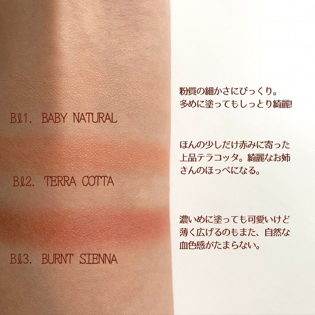 - BL1. ベビーナチュラル タルク, マイカ, シリカ, ナイロン-12, 酸化チタン, ステアロイルオキシステアリン酸オクチルドデシル, フェニルトリメチコン, リンゴ酸ジイソステアリル, ヘキサ(ヒドロキシステアリン酸/ステアリン酸/ロジン酸)ジペンタエリスリチル, ミリスチン酸マグネシウム, ステアリン酸マグネシウム, メチルプロパンジオール, トリ(カプリル酸/カプリン酸)グリセリル, メチコン, プロパンジオール, トリエトキシカプリリルシラン, ジメチコノールエステル, ジメチコン, ラウロイルリシン, 精製水, 赤酸化鉄, 黄酸化鉄, マンガンバイオレット, 黒酸化鉄 BL2. テラコッタ タルク, マイカ, メタクリル酸メチルクロスポリマー, ラウリン酸ヘキシル, ナイロン-12, 酸化チタン, ステアロイルオキシステアリン酸オクチルドデシル, 赤酸化鉄, ジメチコン, ミリスチン酸マグネシウム, マンガンバイオレット, 1,2-ヘキサンジオール, 黄酸化鉄, トリエトキシカプリリルシラン, 水酸化アルミニウム, カプリン酸グリセリル, グンジョウバイオレット, 赤226, メチコン BL3. バーントシエナ タルク, ナイロン-12, マイカ, メタクリル酸メチルクロスポリマー, ラウリン酸ヘキシル, リンゴ酸ジイソステアリル, エチレンアクリレートコポリマー, ステアロイルオキシステアリン酸オクチルドデシル, ジメチコン, 黄酸化鉄, ミリスチン酸マグネシウム, 1,2-ヘキサンジオール, トリエトキシカプリリルシラン, 赤酸化鉄, 黒酸化鉄, カプリン酸グリセリル, 水酸化アルミニウム, 赤226