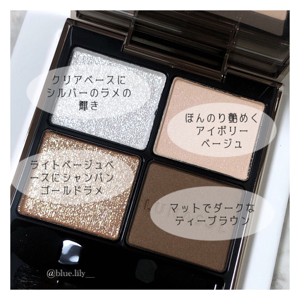 上質なシルキーな粉感もさすがのゲランで好みです。瞼にしっかりと密着して深みのある発色を叶えてくれます。 セミマットなベージュやシアーブラックの上にシルバーパールやサテンの艶めきのあるモーブグレージュを重ねるとなんとも美しいツヤが瞼を彩ってくれます 一見パールシルバーが派手に見えますがブラシでふわりと乗せることで月明かりを宿したような上品な艶感を添えてくれます